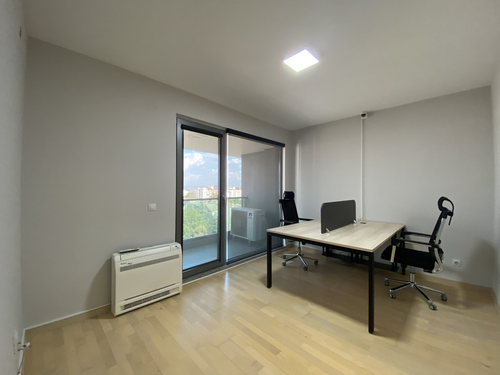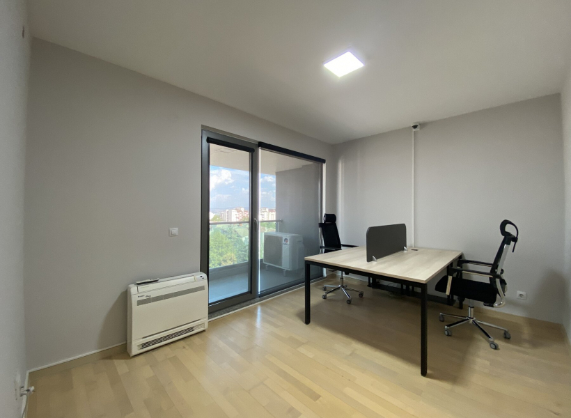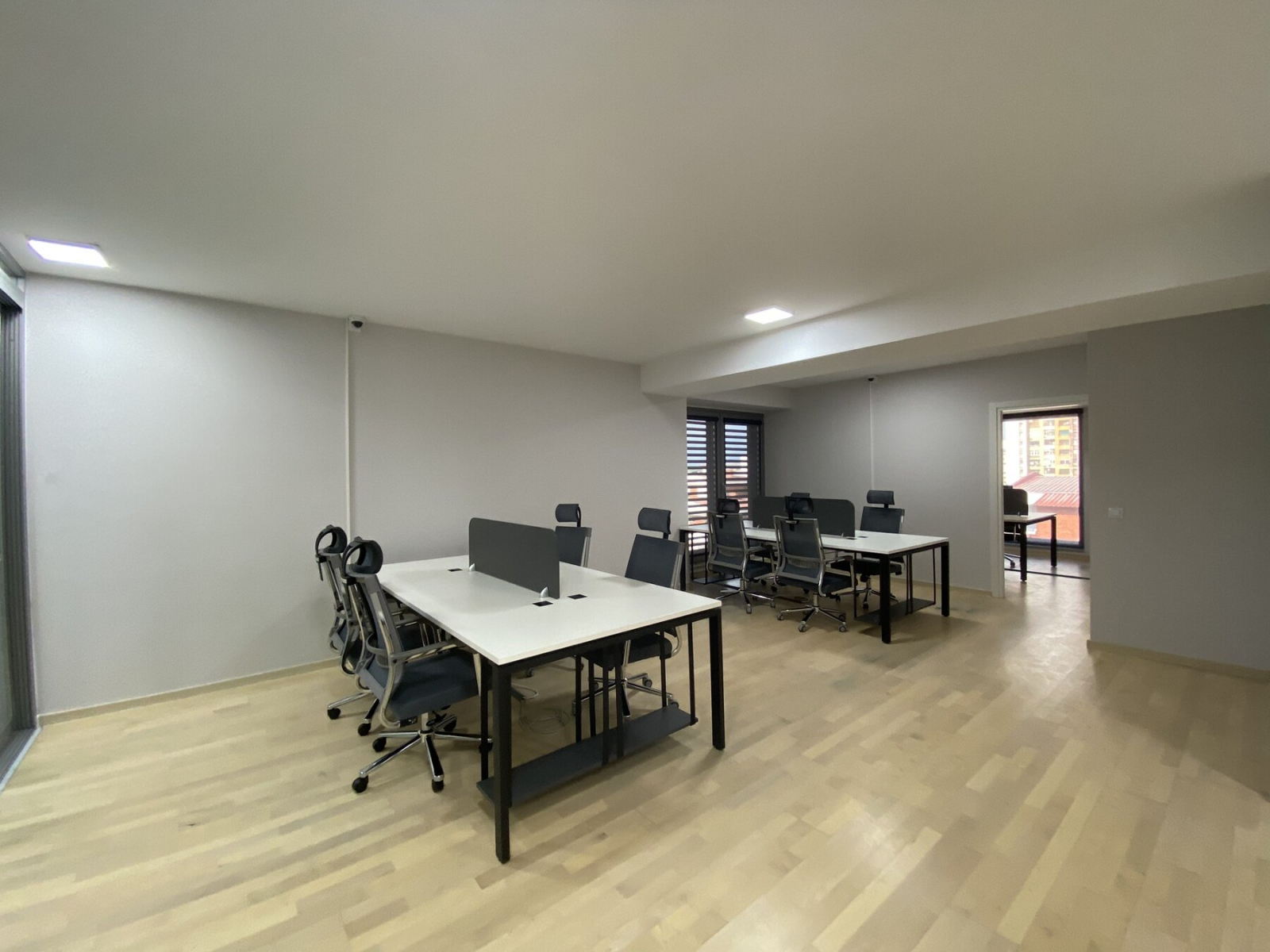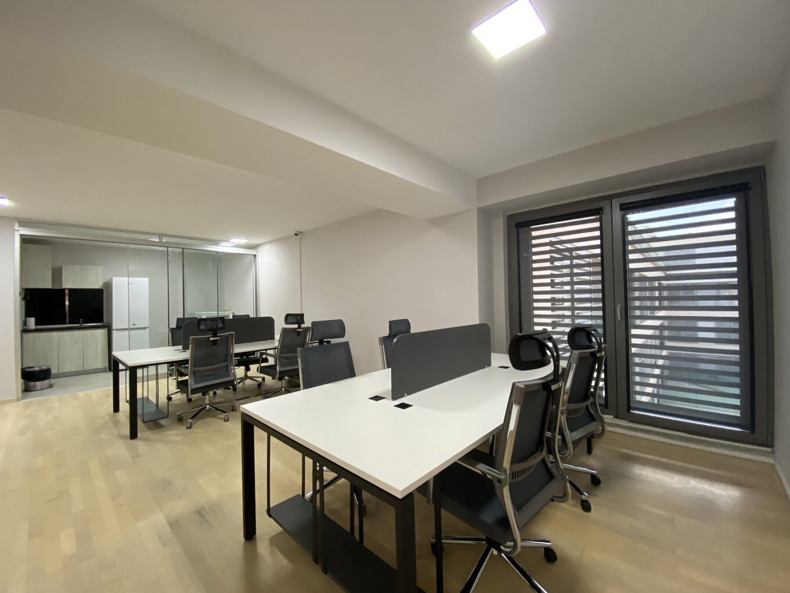 The space has one open office space, two separate offices, two bathrooms, kitchen and a 5m2 terrace.