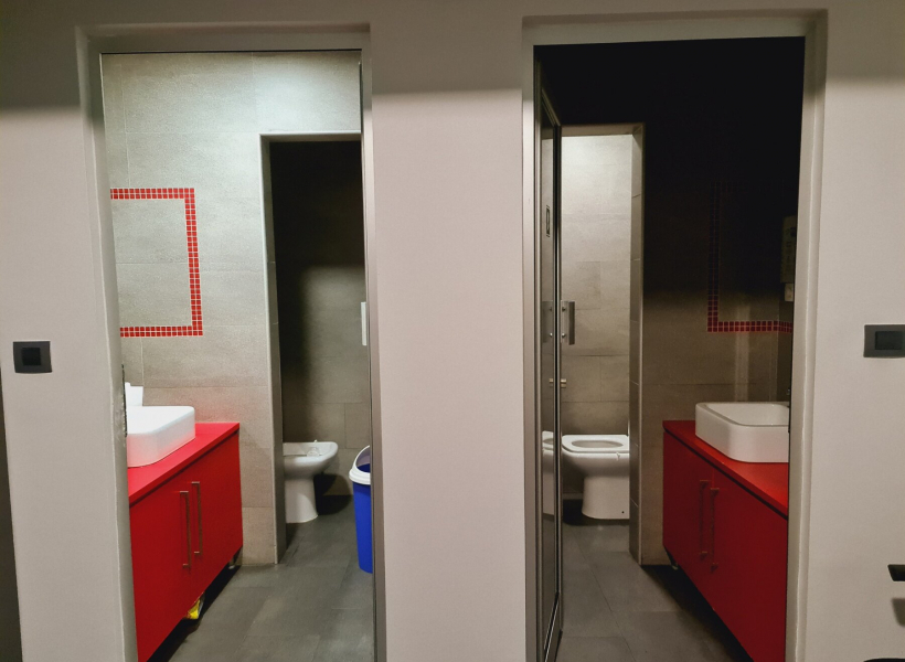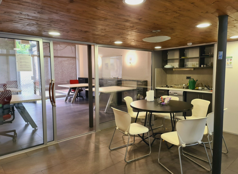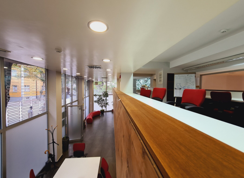 The space is divided into three levels, most of the space extends to the ground floor, which has a reception area, separate manager's office, equipped kitchen, working area and also from the ground floor there is access to a small yard.