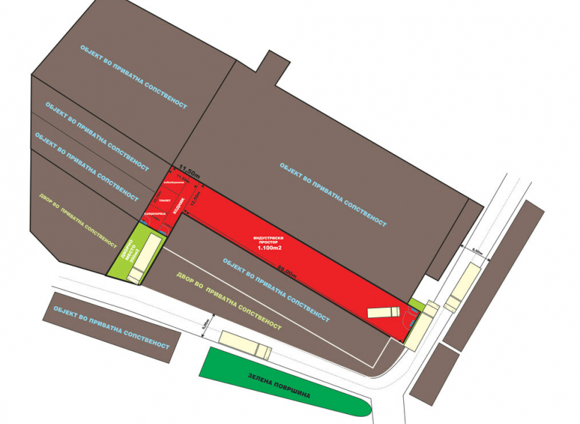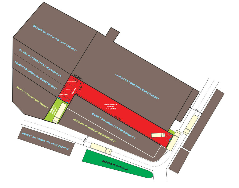 Renovated industrial building for rent in Bitola with a total area of 1400m2 with a height of 8m, with two entrances, with dimensions 84m x 12.50m as a whole of 1100m2 which can be divided into two parts, 600m2 and 800m2, available for rent independently from each other with separate entrances.