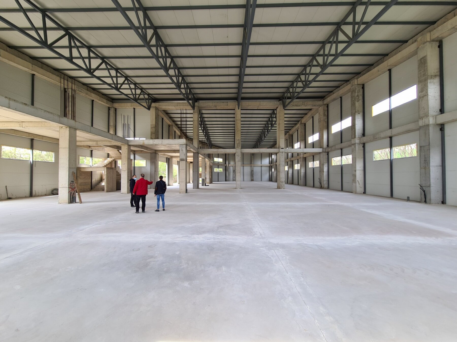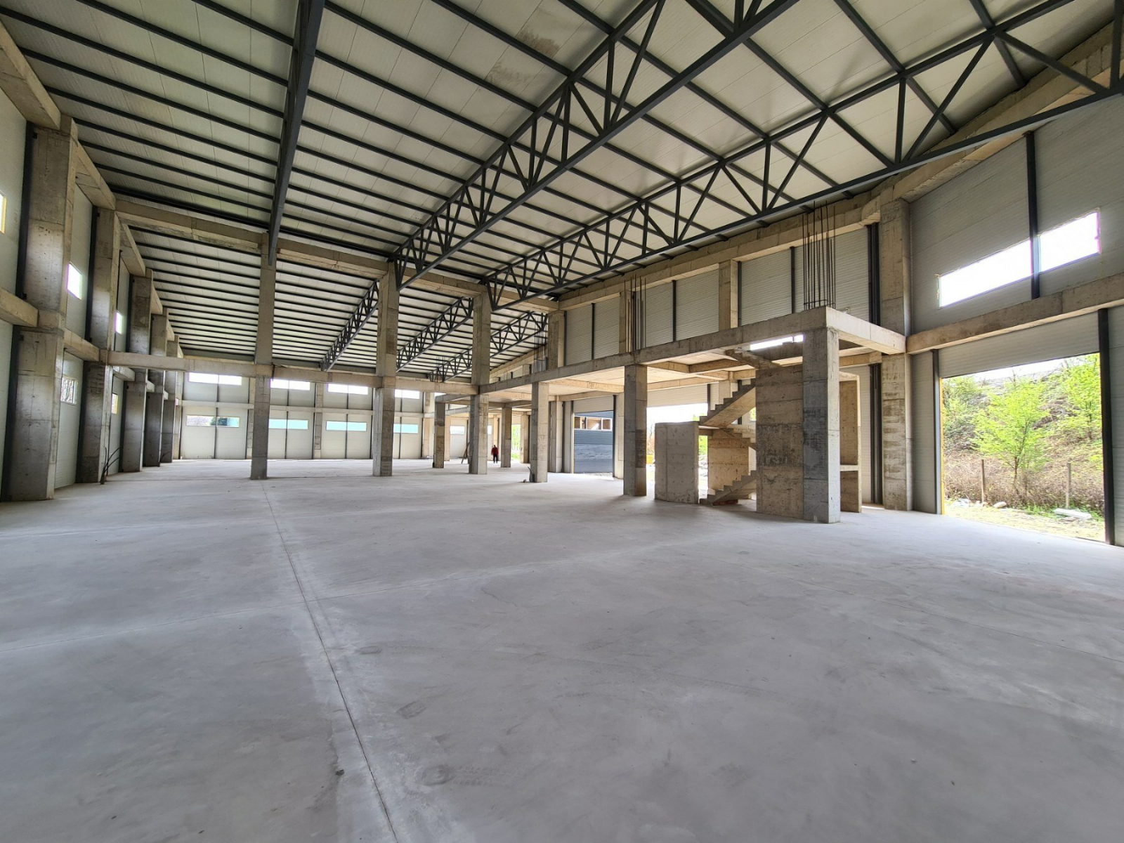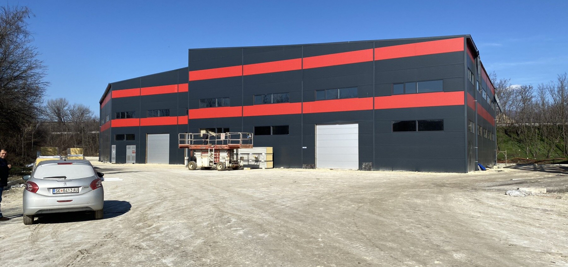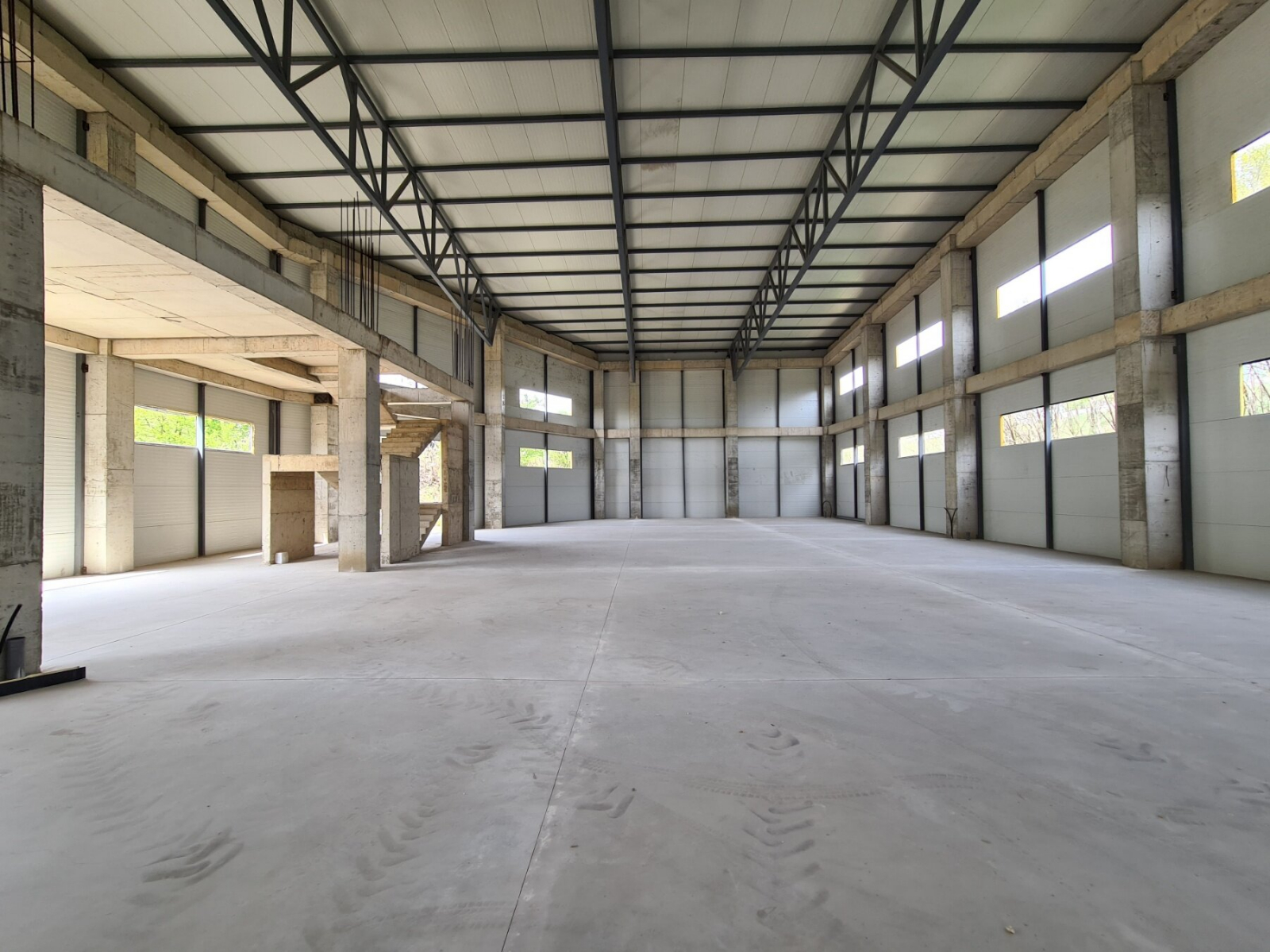 The warehouse has a total area of 1800m2, it is 10m high, and it has three separate entrances. In the warehouse there is an office part which is on a level.