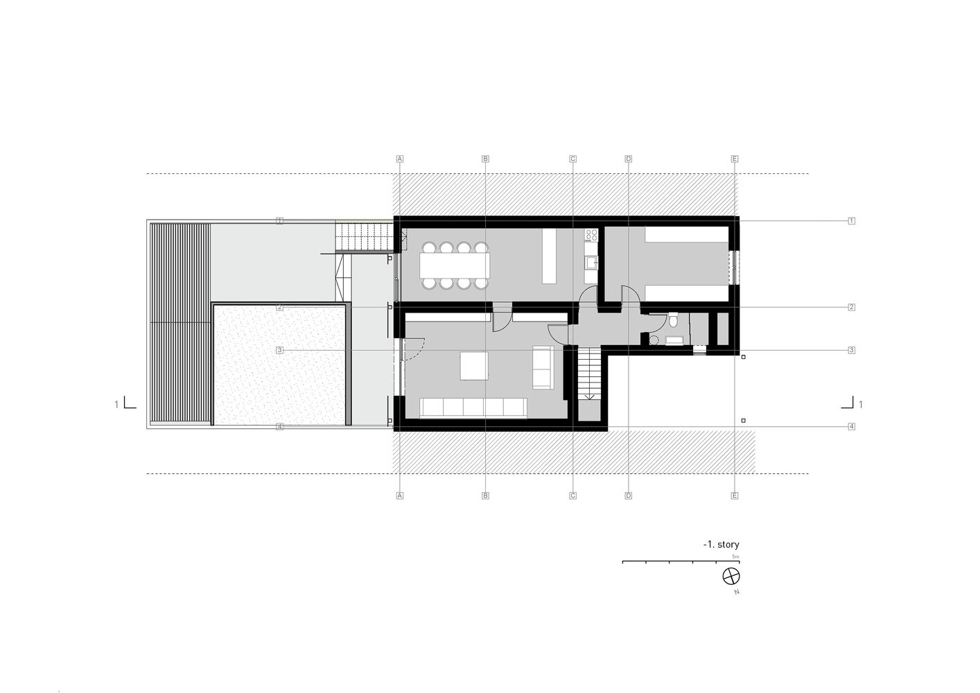 Подрум - со дневен престој, кујна и трпезарија, бања, технички простор и двор.