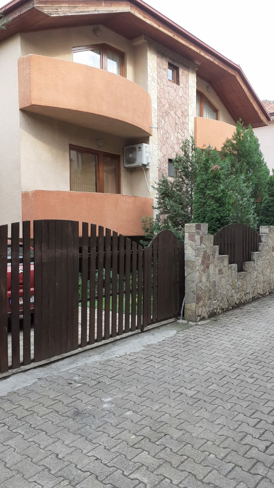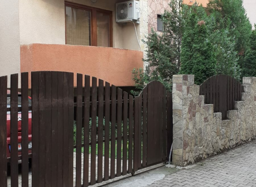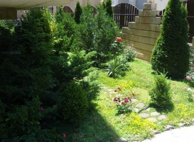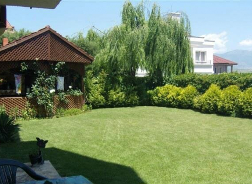Во предниот дел се наоѓа порта и 3 паркинг места, а задниот дел е опремен со фурна и скара, како и место за седење и тревник.