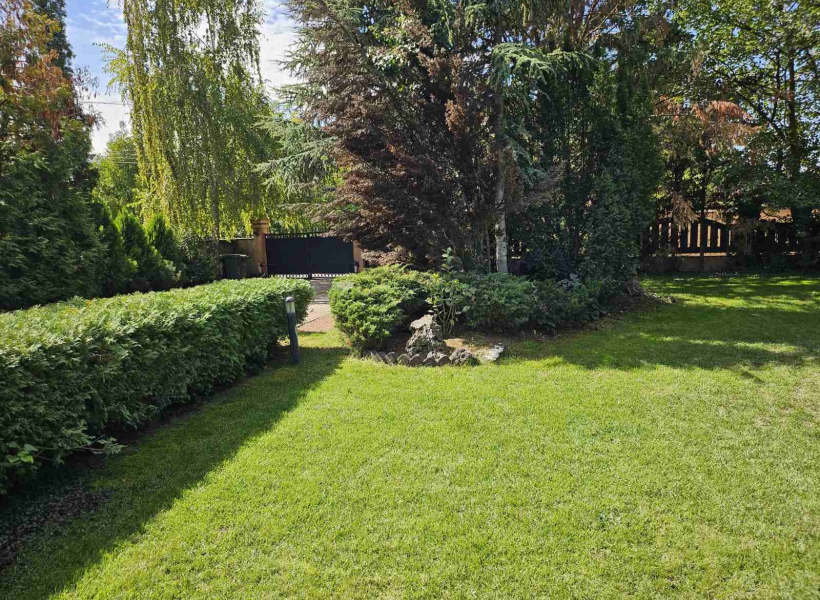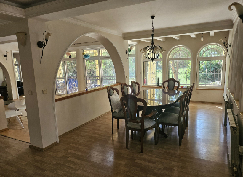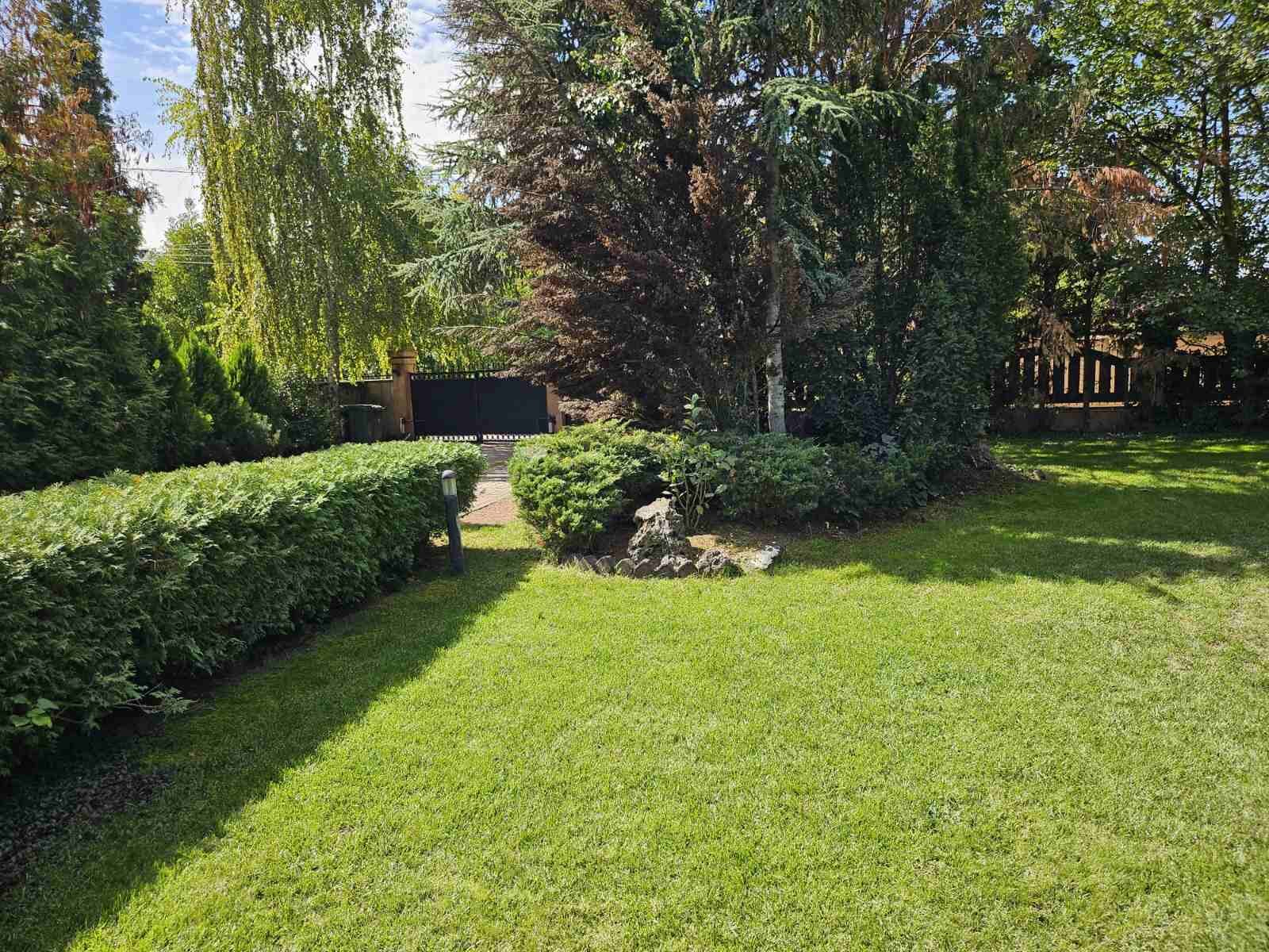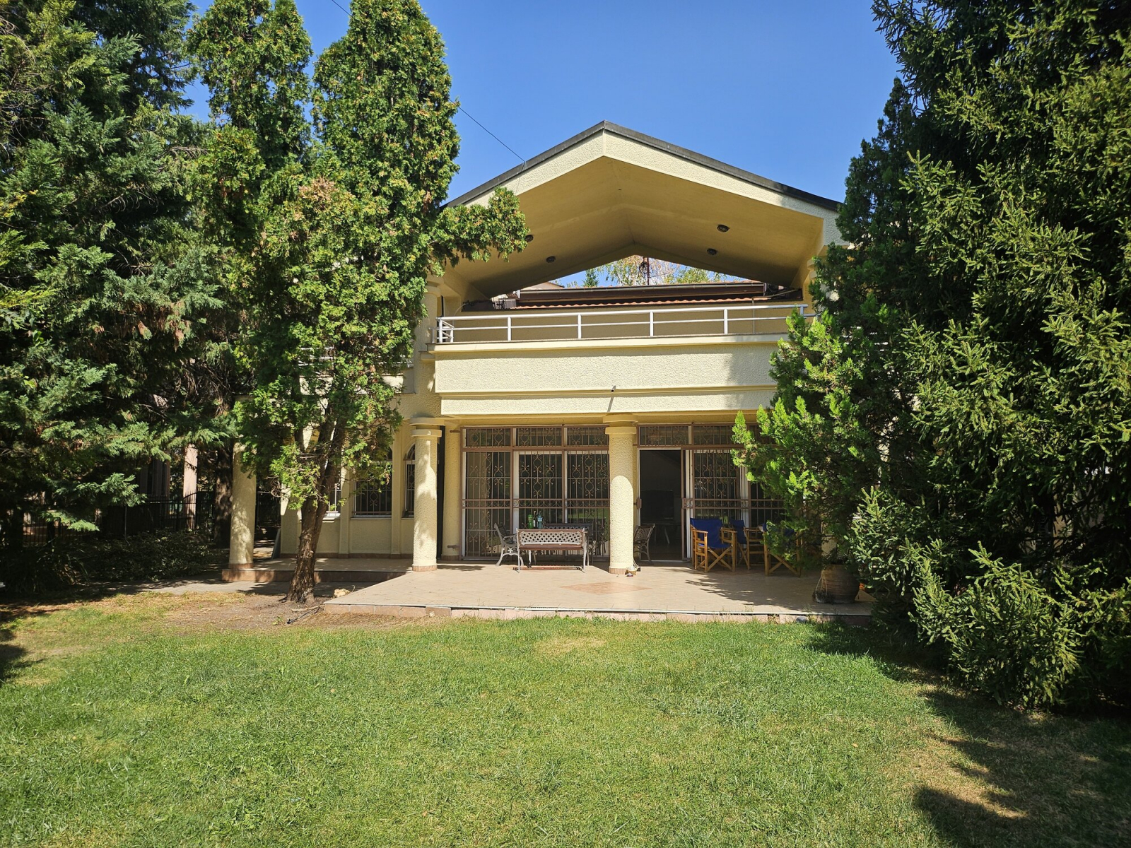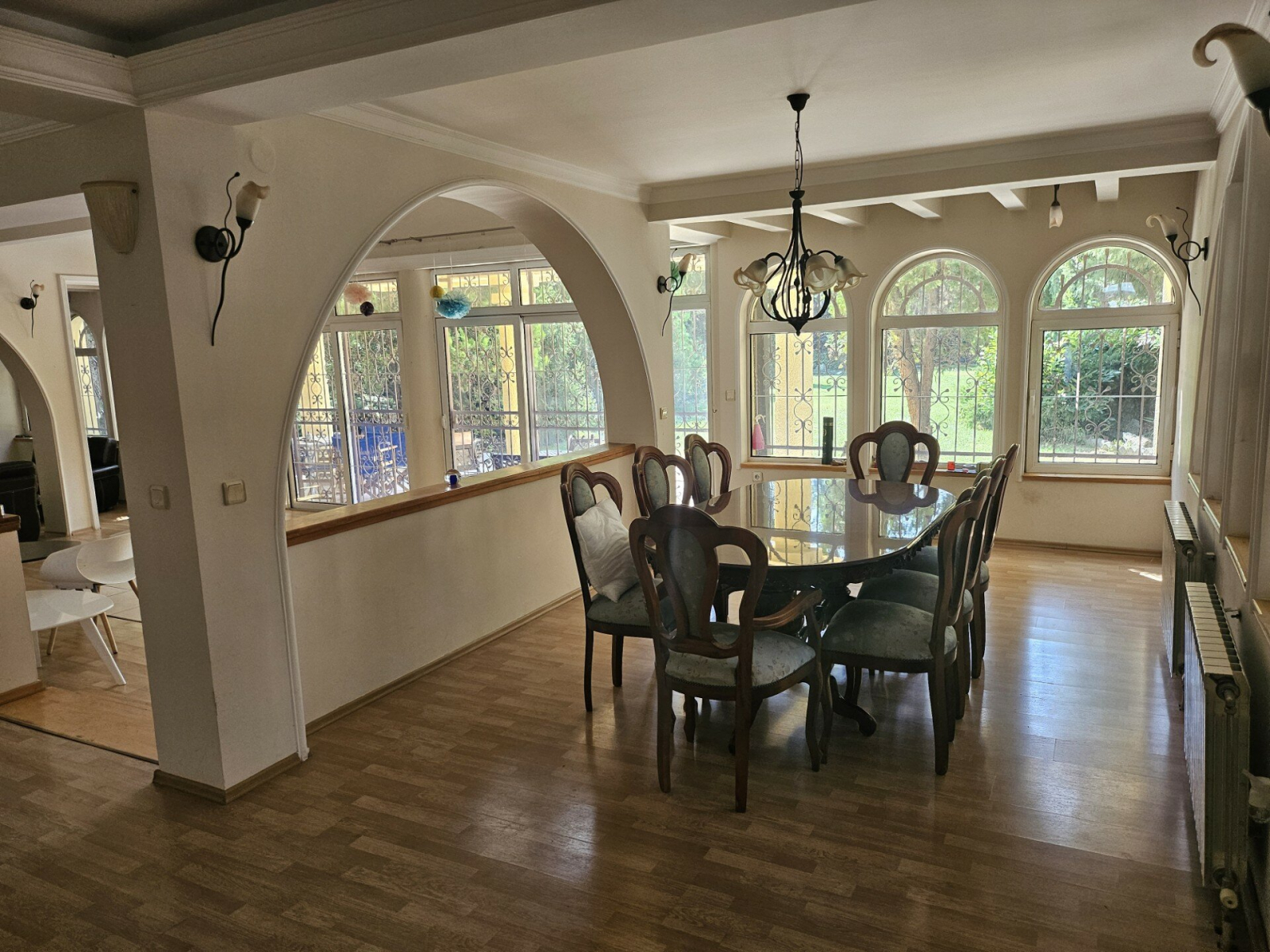 Внатрешната површина е 350м2. Плацот е 1800м2. Куќата е опкружена со големи дрвја и зеленило, што го прави дворот интимен и погоден за деца.