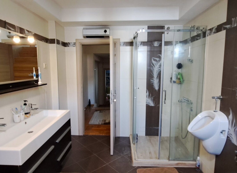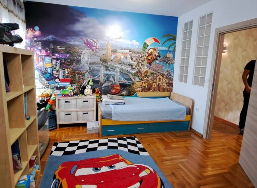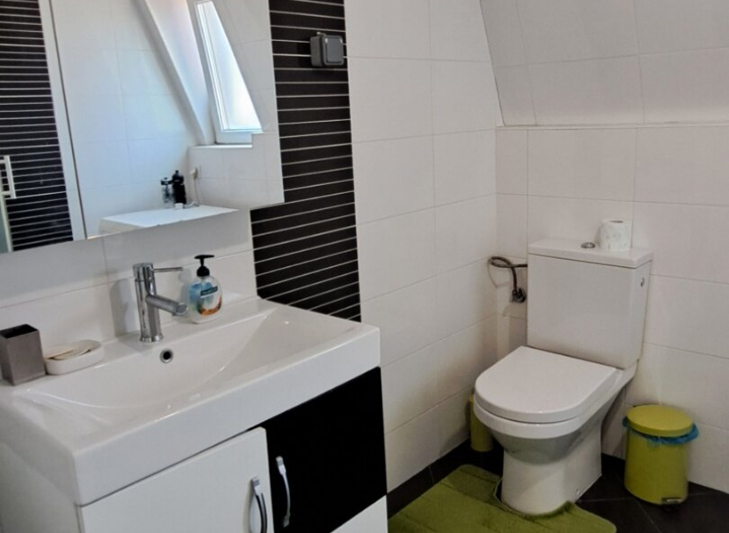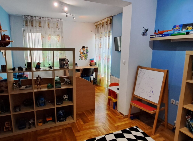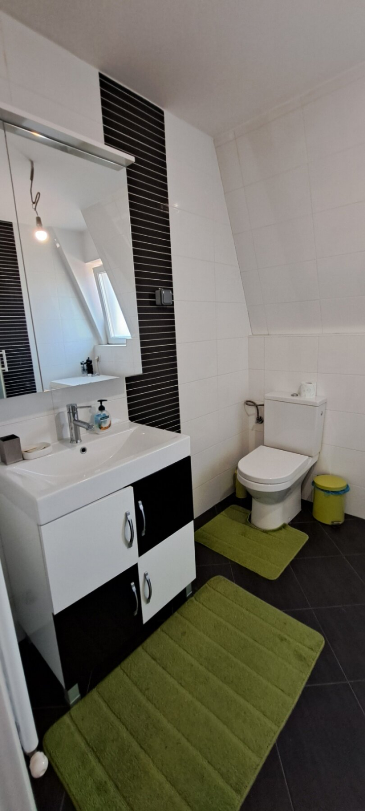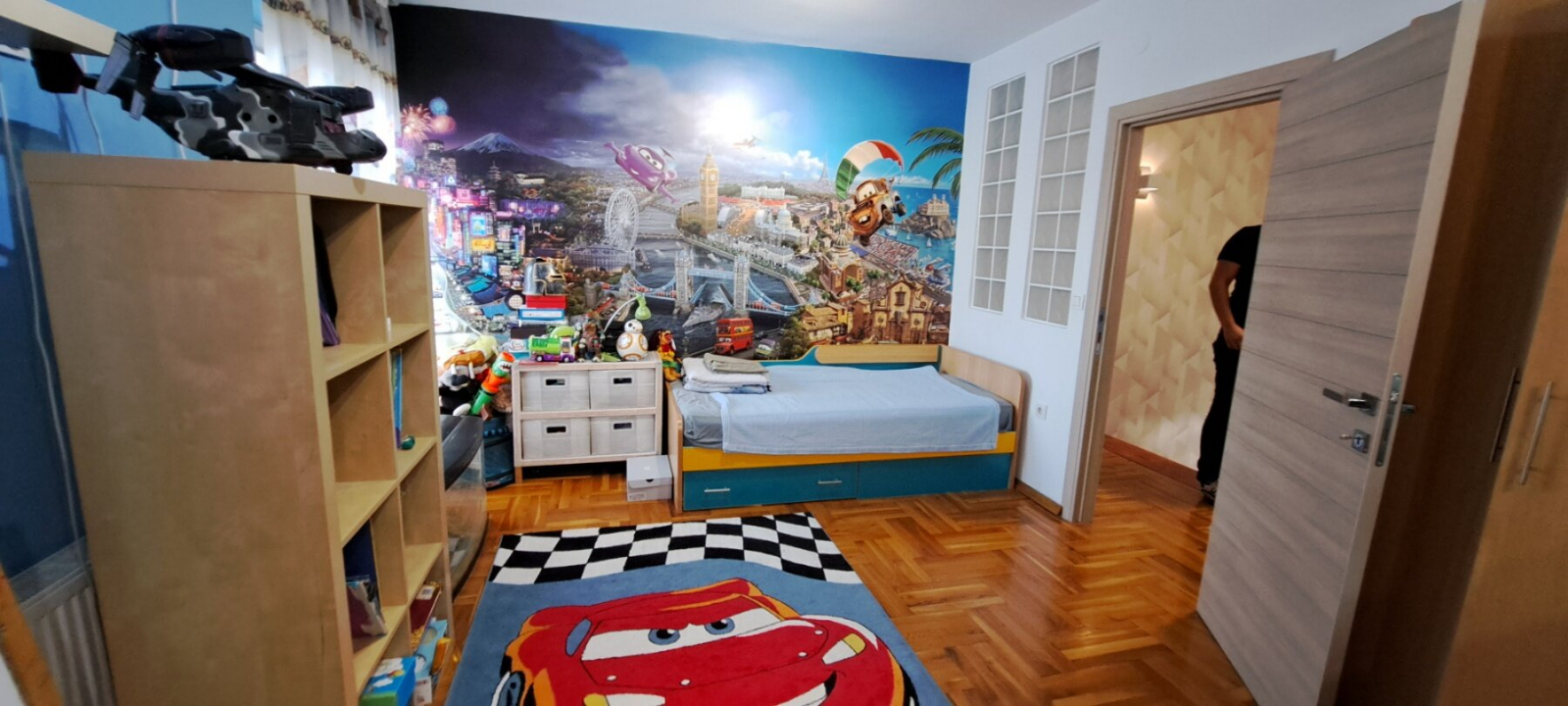 Прв кат - 1 детска соба, 1 спална соба, бања, остава со плакар.