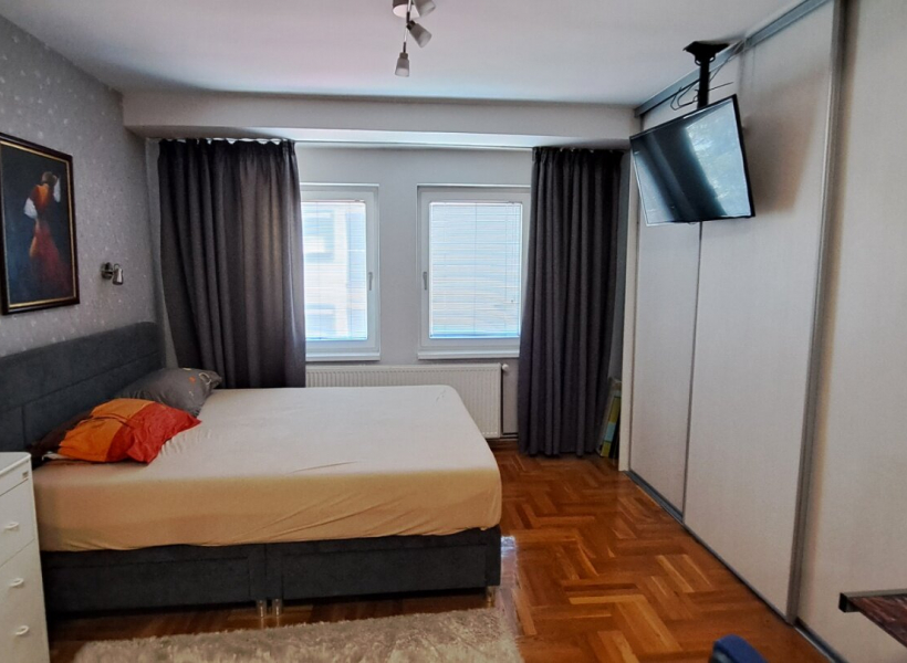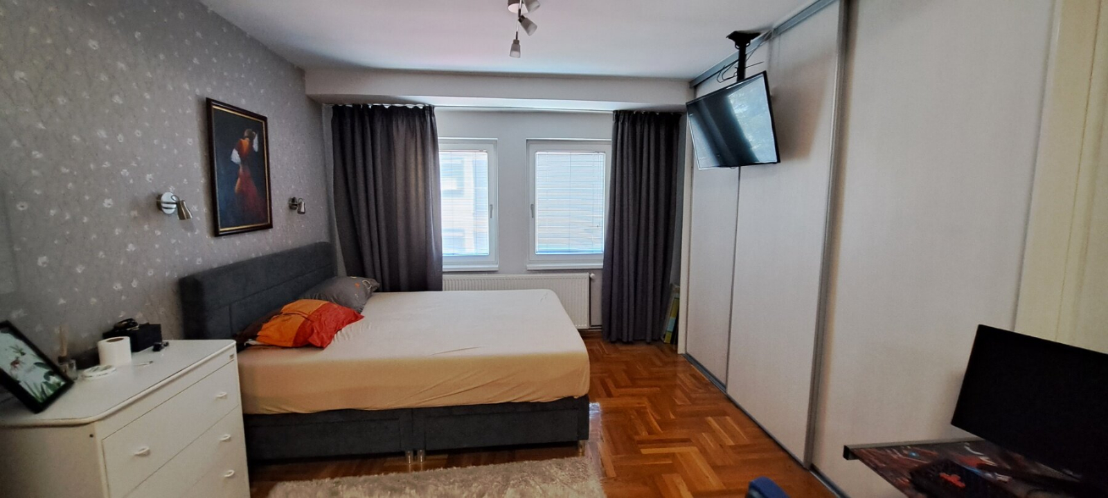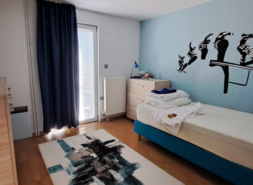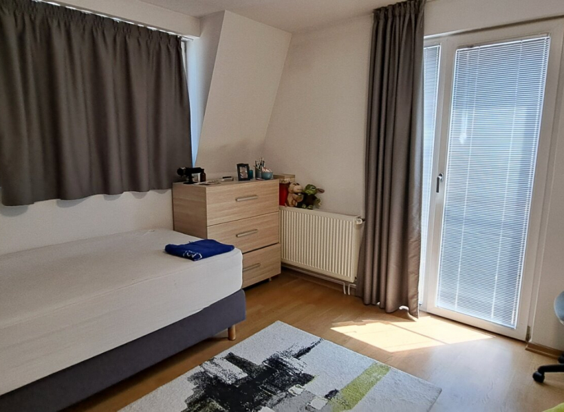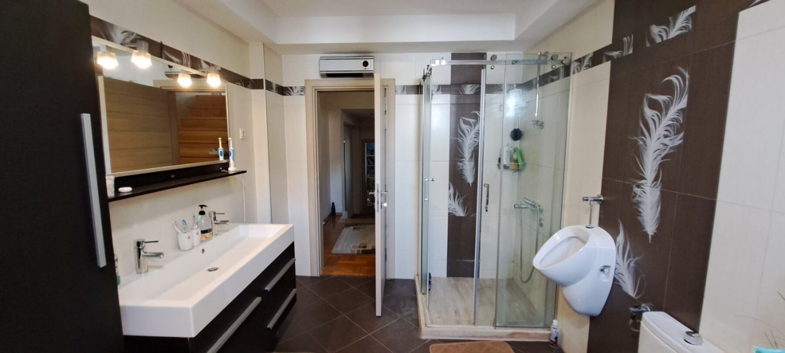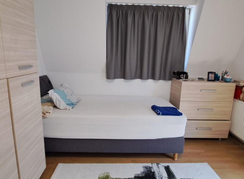 Прв кат - 1 детска соба, 1 спална соба, бања, остава со плакар.