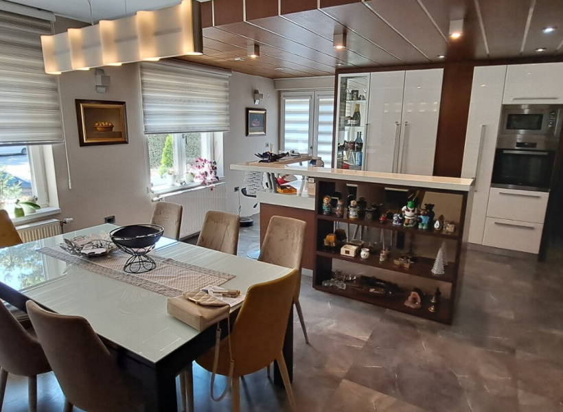 Приземјето располага со пространа дневна соба, трпезарија и кујна.