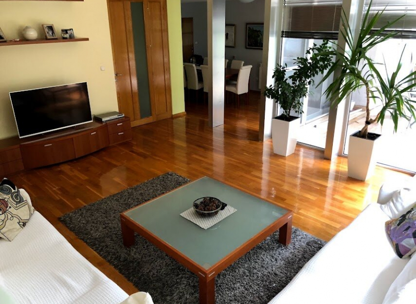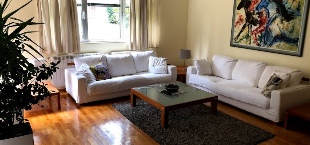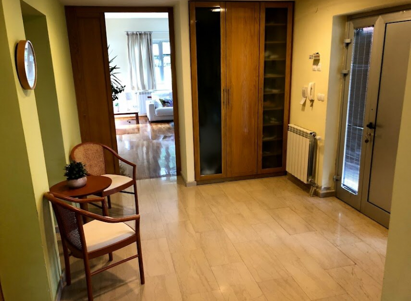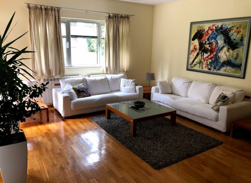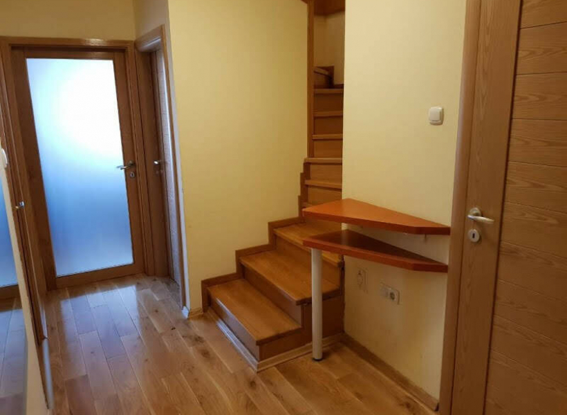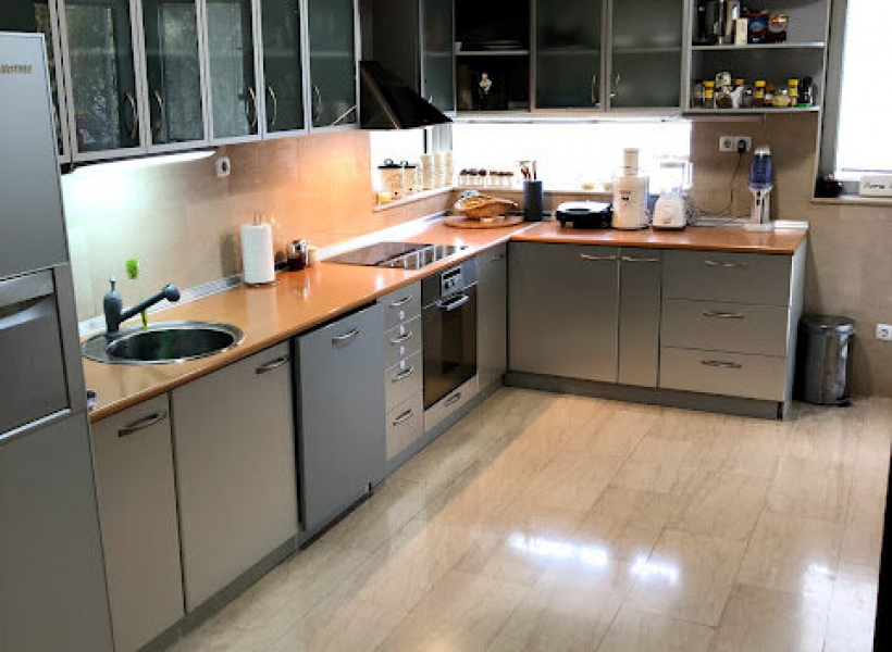 Куќата располага со две дневни простории, две трпезарии, комплетно опремена кујна, три спални соби, две бањи и остава, walk in closet, гаражен простор и подрум со остава.