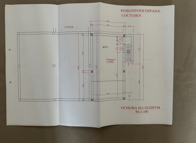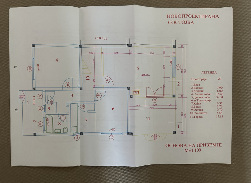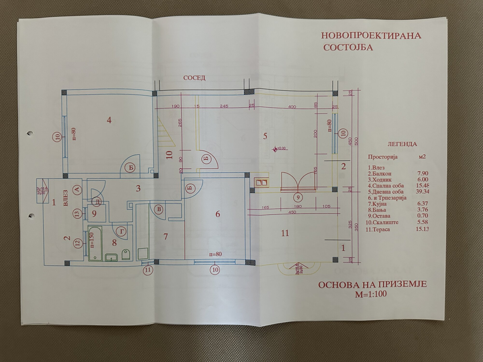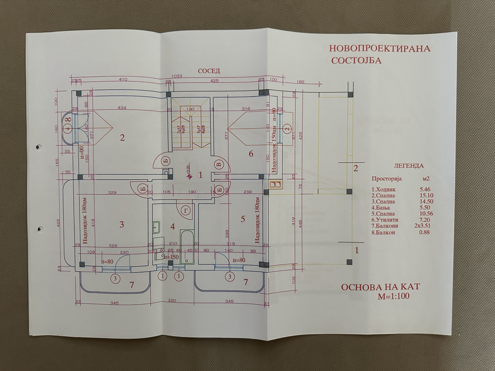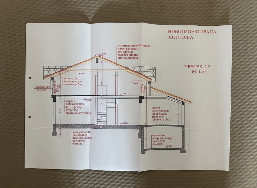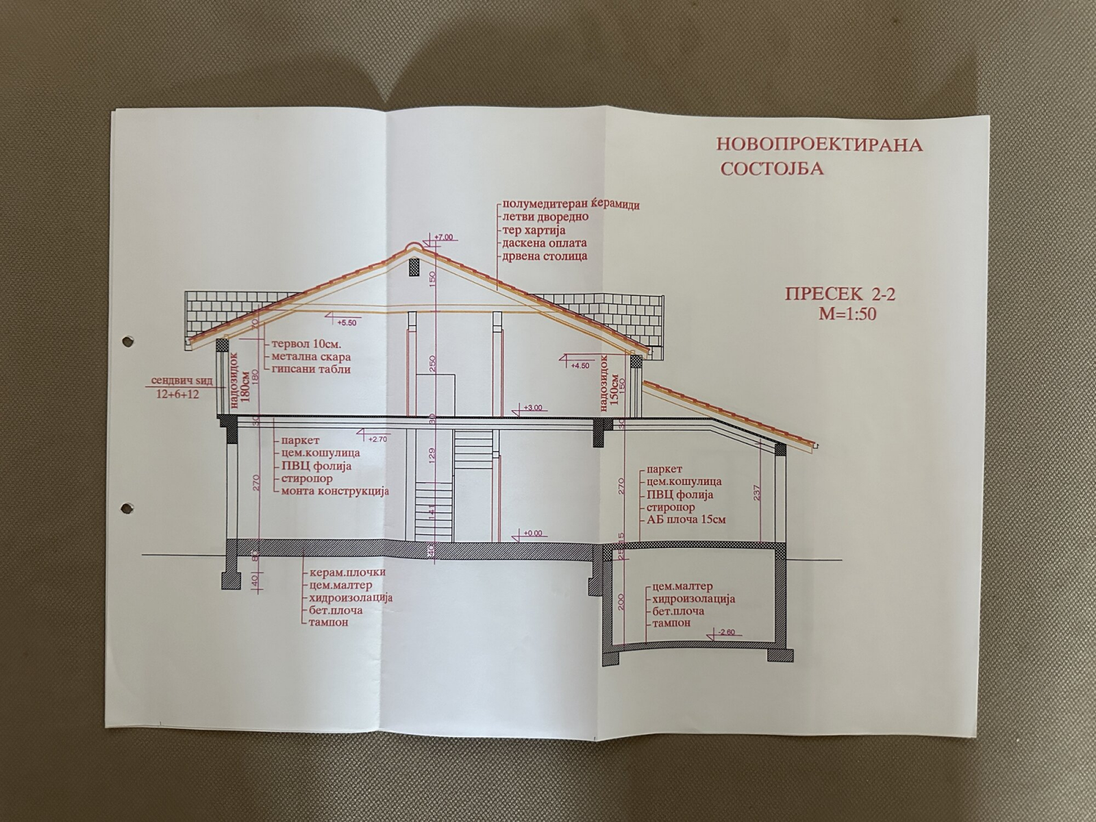 Куќата го има следниот распоред: дневна соба, тарпезарија, кујна, 2 остави, 2 тоалети, 5 спални соби.