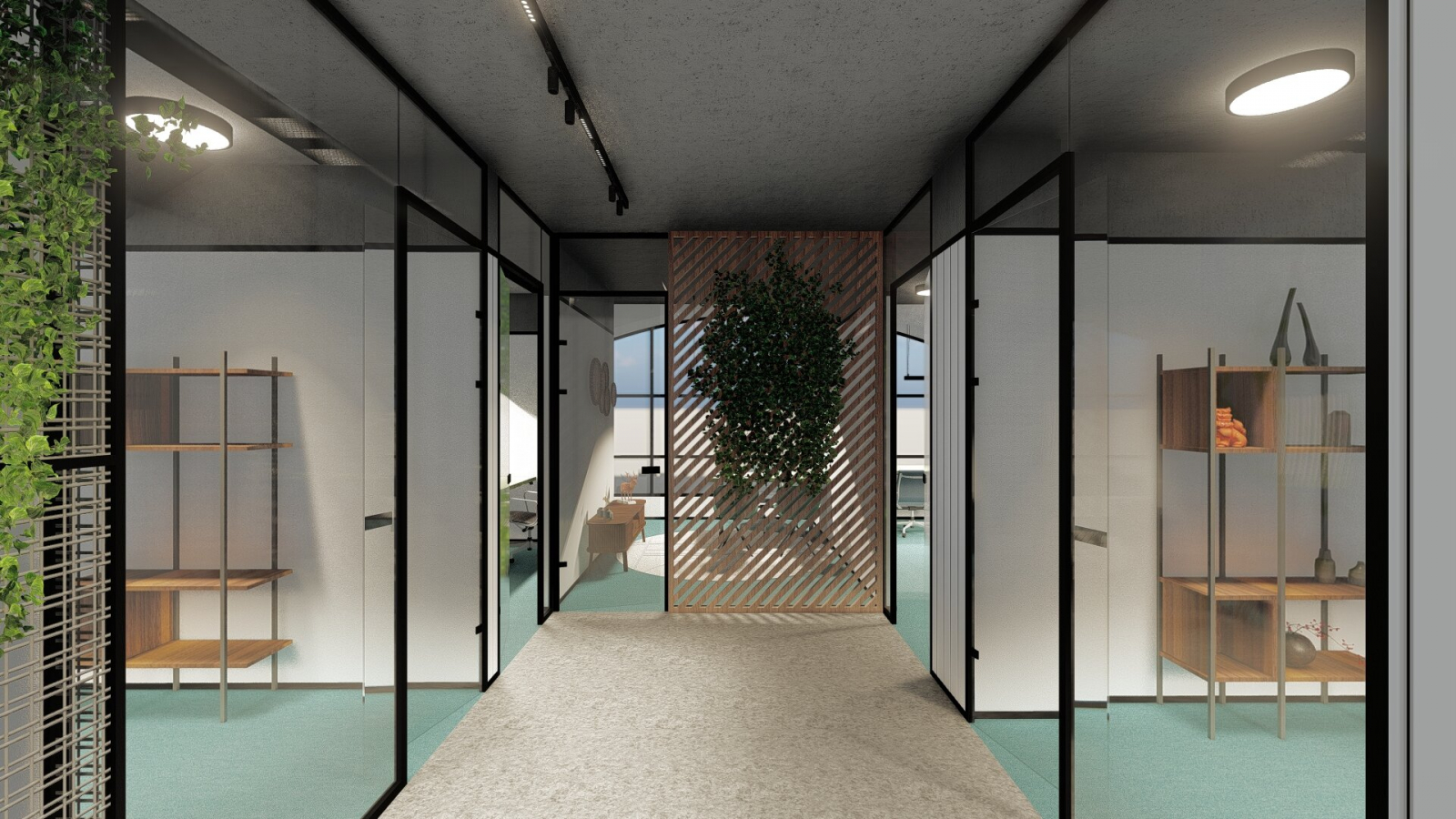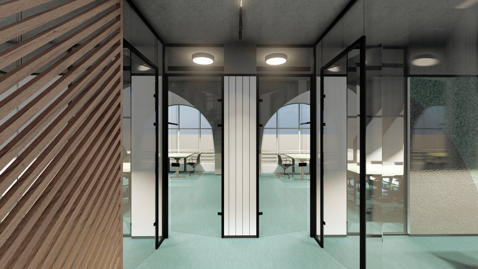 The work space is an open-concept floor plan with a mix of open office space and workstations, private conference rooms and game rooms in close association with casual break out areas.