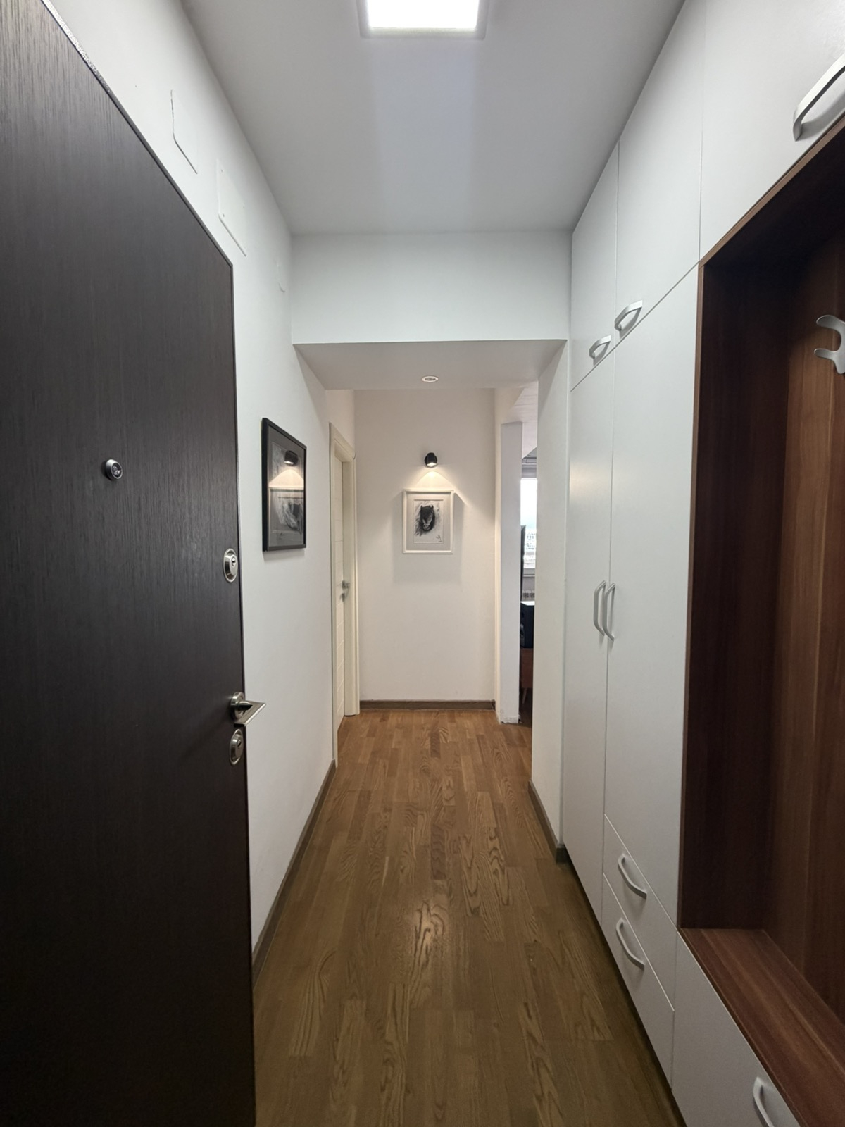Станот е лоциран на 11ти кат и располага со вкупна површина од 82м2, односно со две спални соби, два тоалети, дневна просторија со трпезарија, опремена кујна и тераса со отворен поглед.
