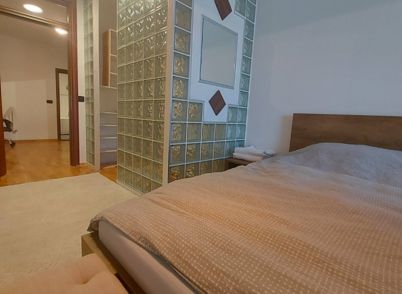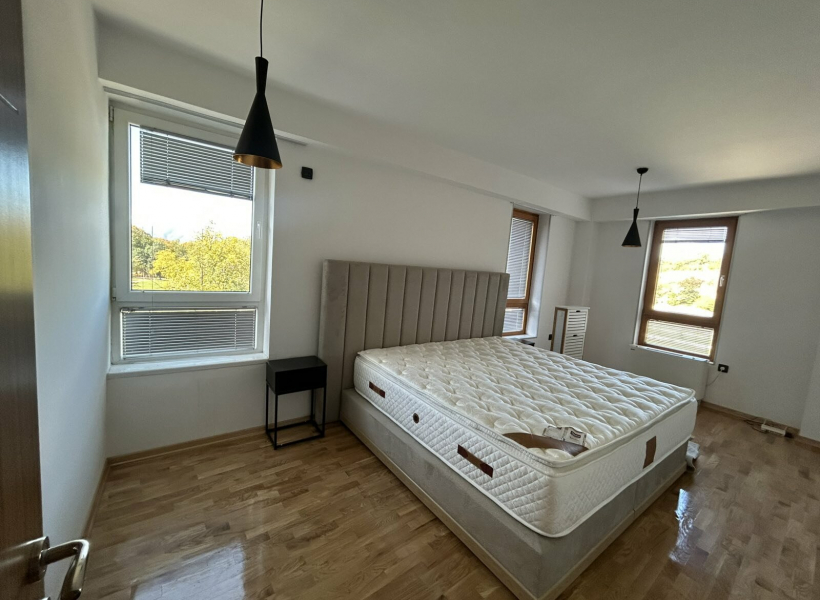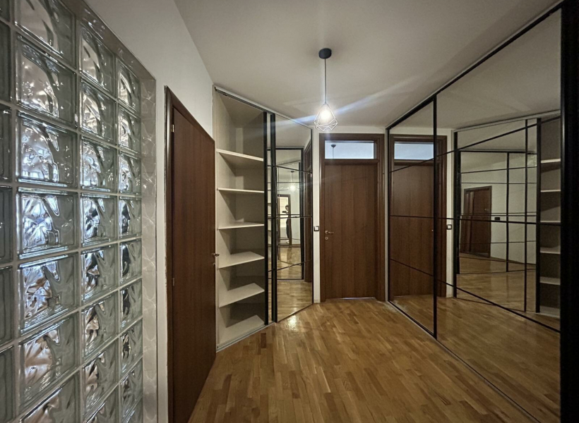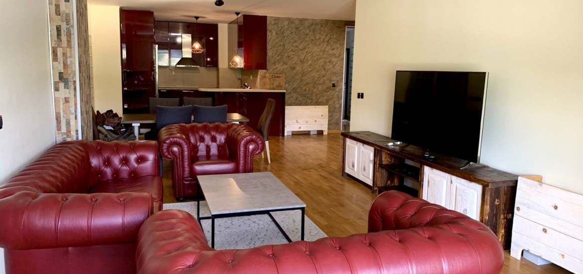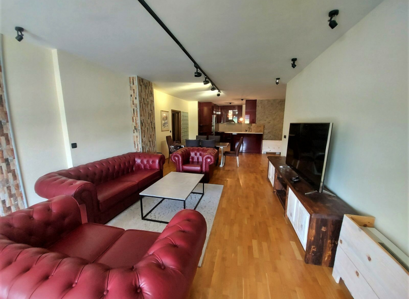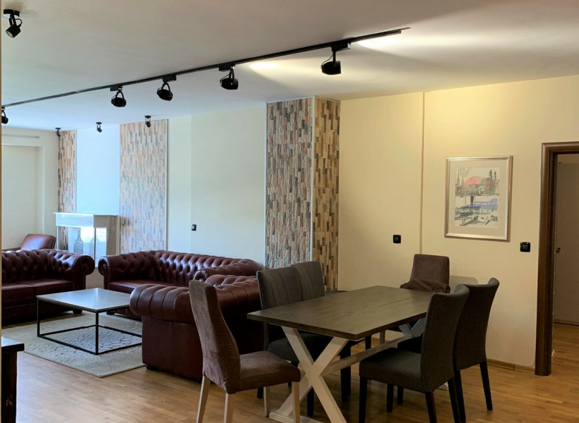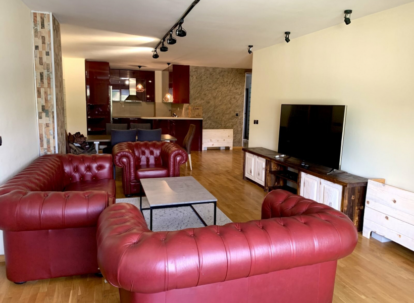 Се изнајмува комплетно опремен стан на одлична локација во близина на градски парк, со вкупна површина од 150м2, лоциран на трети кат.