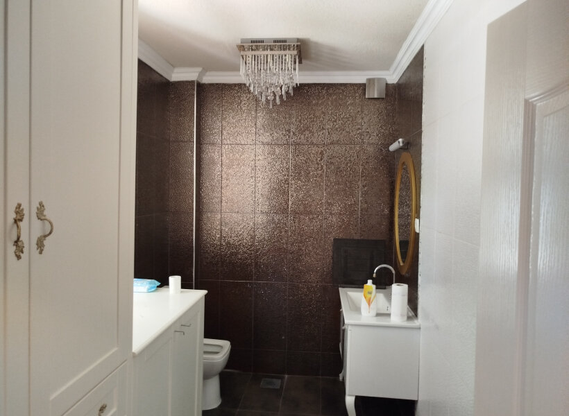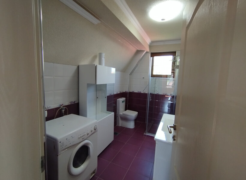 Прв кат: Пространа и светла дневна соба, кујна, тоалет и голема тераса.