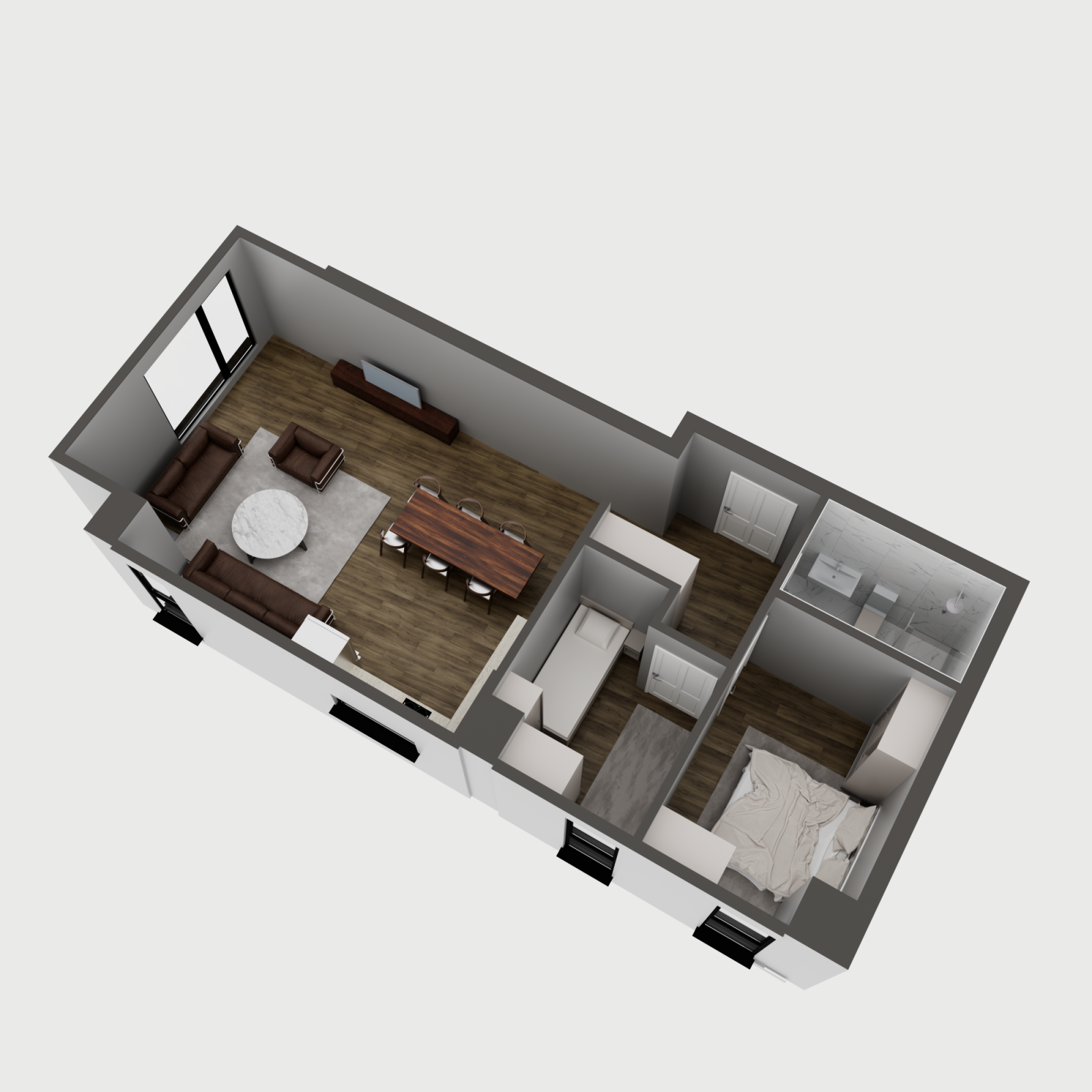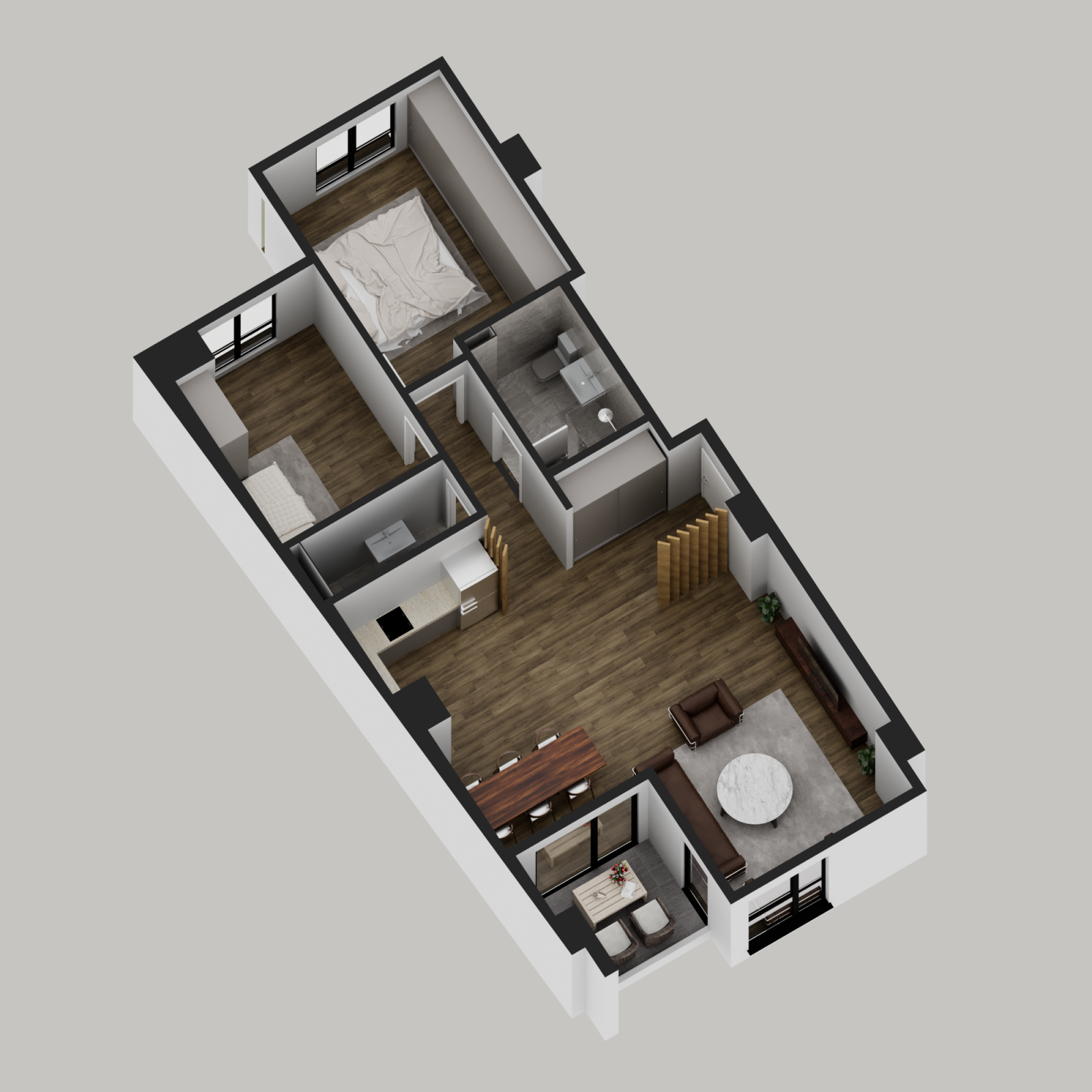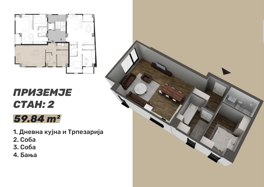 Стан 2 – 60м²: дневна соба, кујна со трпезарија, две спални соби и бања