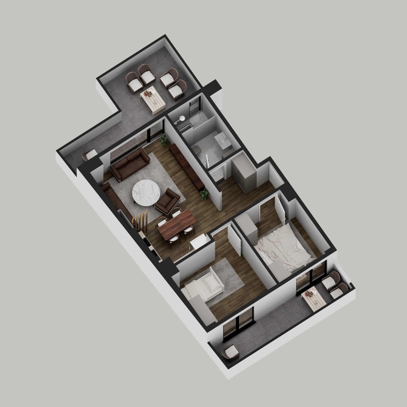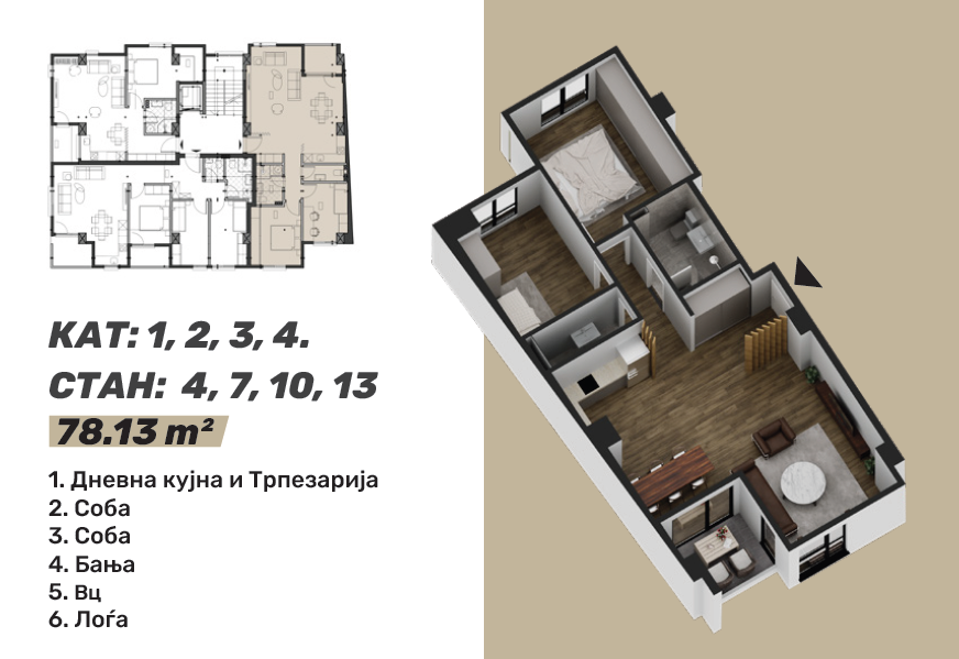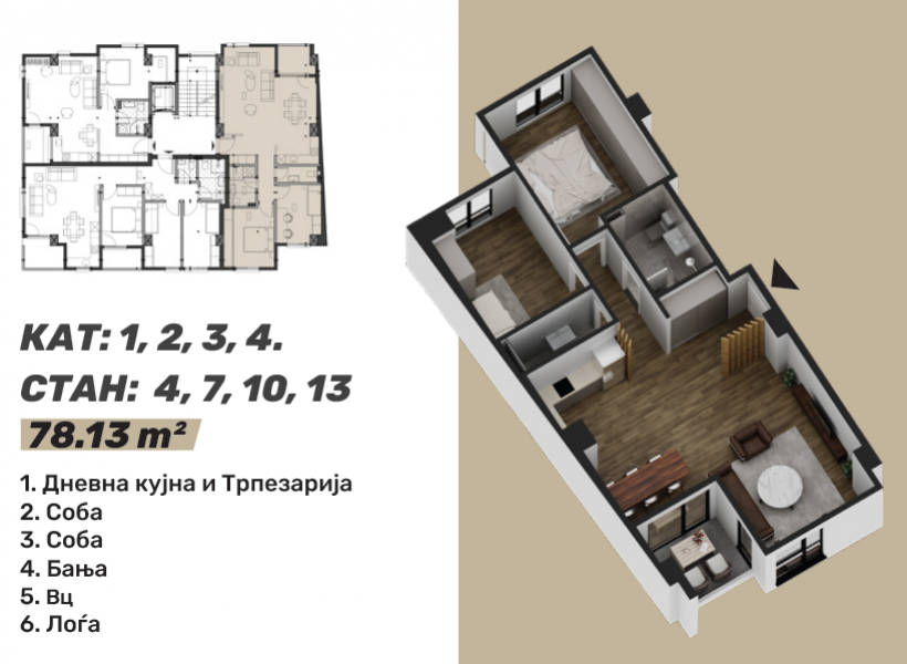 Стан 4 / 7 / 10 / 13 – 78м²: дневна соба, кујна со трпезарија, две спални соби, бања, тоалет и тераса