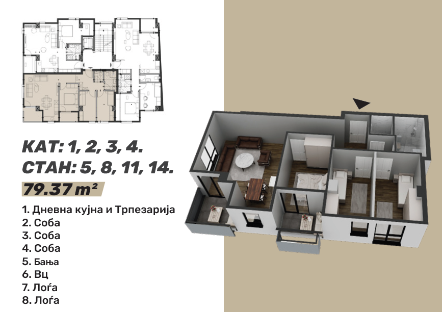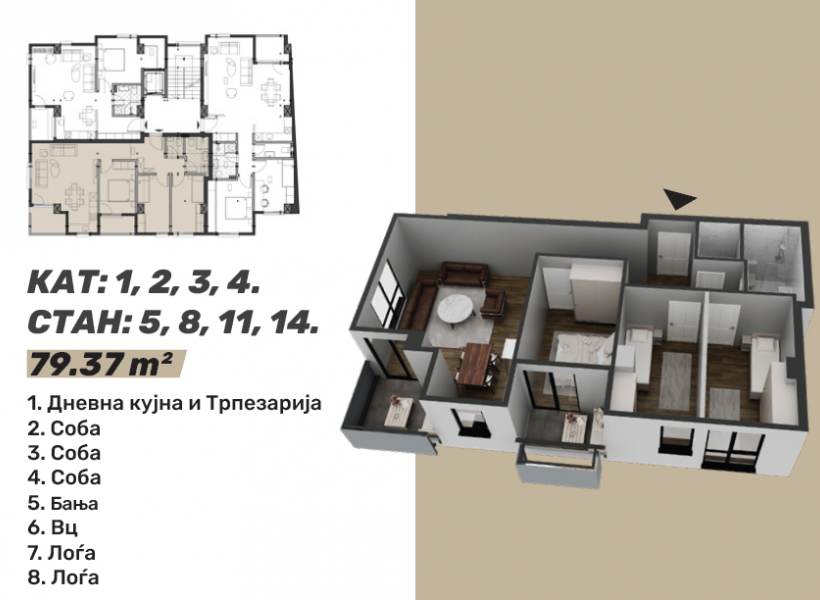 Стан 5 / 8 / 11 / 14 – 79м²: дневна соба, кујна со трпезарија, три спални соби, бања, тоалет и тераса
