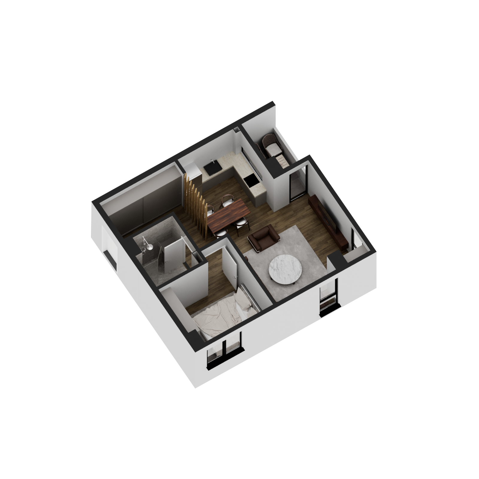 Стан 3 – 47м²: дневна соба, кујна со трпезарија, една спална соба, бања и терасаса
