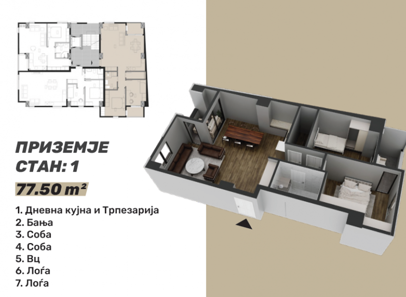 Стан 1 – 78м²: дневна соба, кујна со трпезарија, две спални соби, бања, тоалет и две тераси