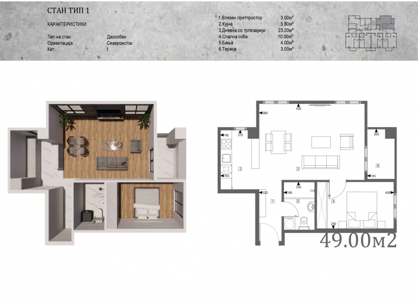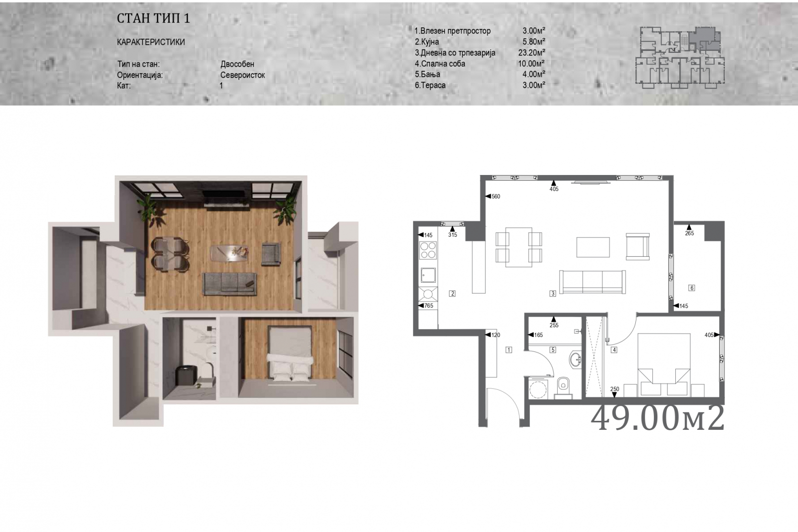• Стан тип 1 – 49м², прв кат: дневна со кујна и трпезарија, спална, бања, тераса