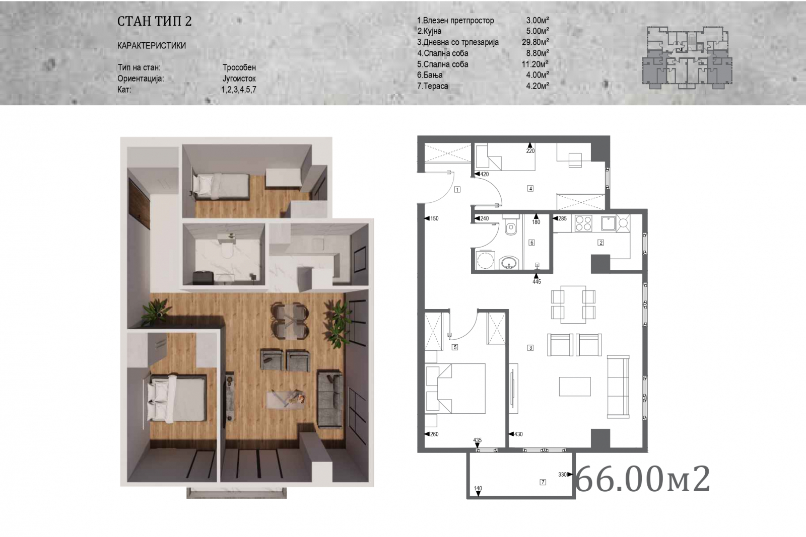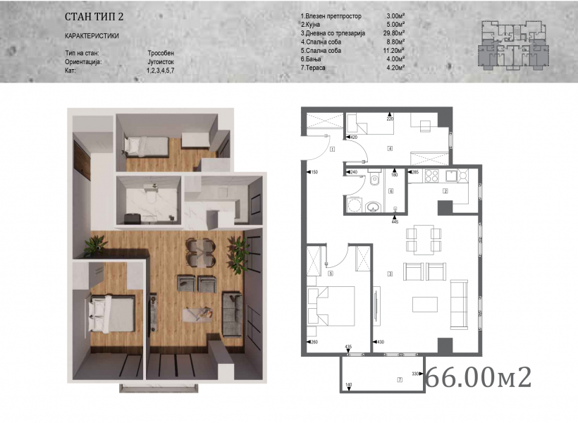 • Стан тип 2 – 66м², прв, втор, трет, четврт, петти и седми кат: дневна, кујна со трпезарија, две спални, бања, тераса
