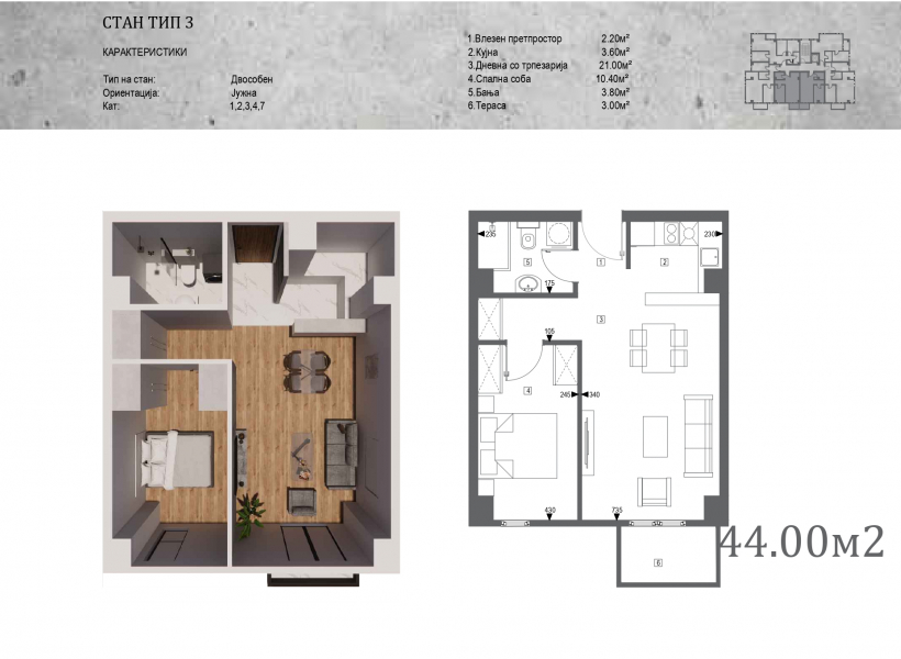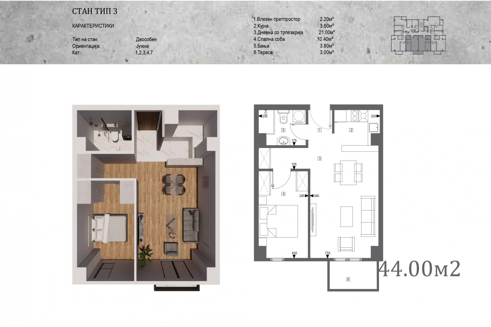 • Стан тип 3 – 44м², прв, втор, трет, четврти и седми кат: дневна, кујна со трпезарија, спална, бања, тераса