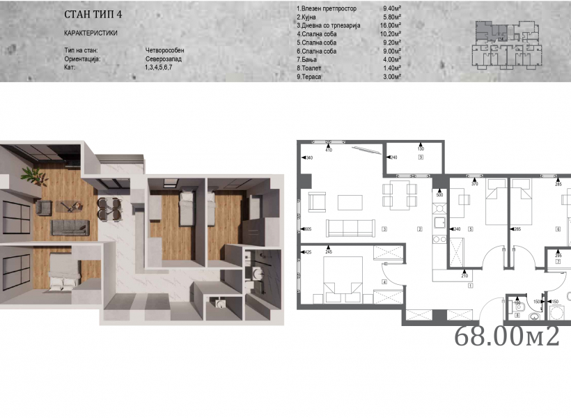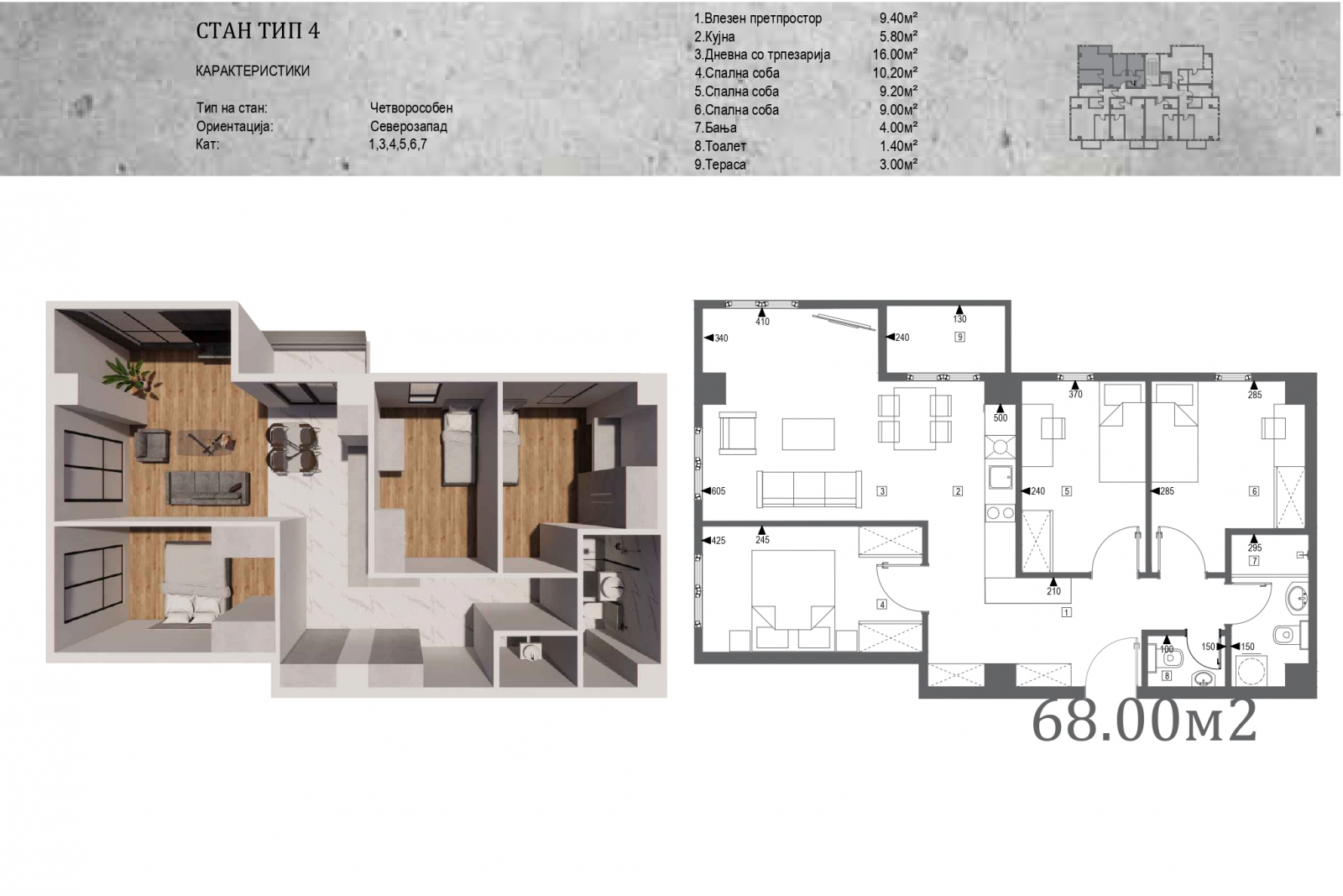 • Стан тип 4 – 68м², прв, трети, четврти, петти, шести и седми кат: дневна, кујна со трпезарија, три спални, бања, тоалет, тераса