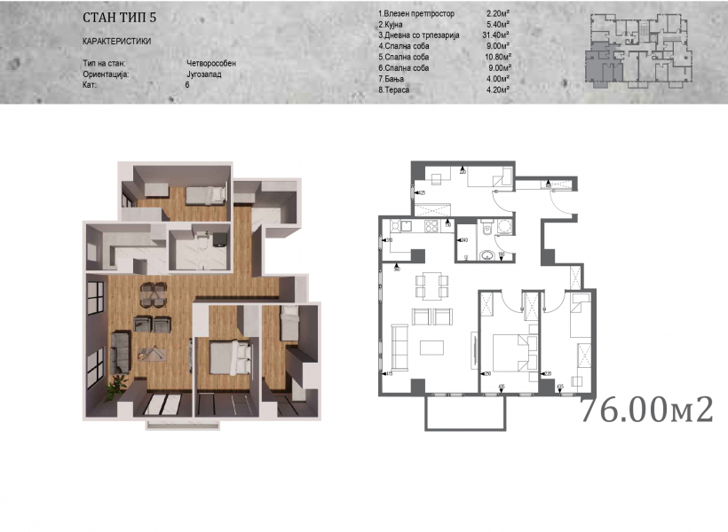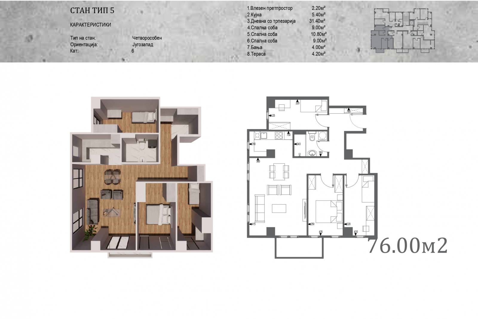 • Стан тип 5 – 76м², шести кат: дневна, кујна со трпезарија, три спални, бања, тоалет, тераса