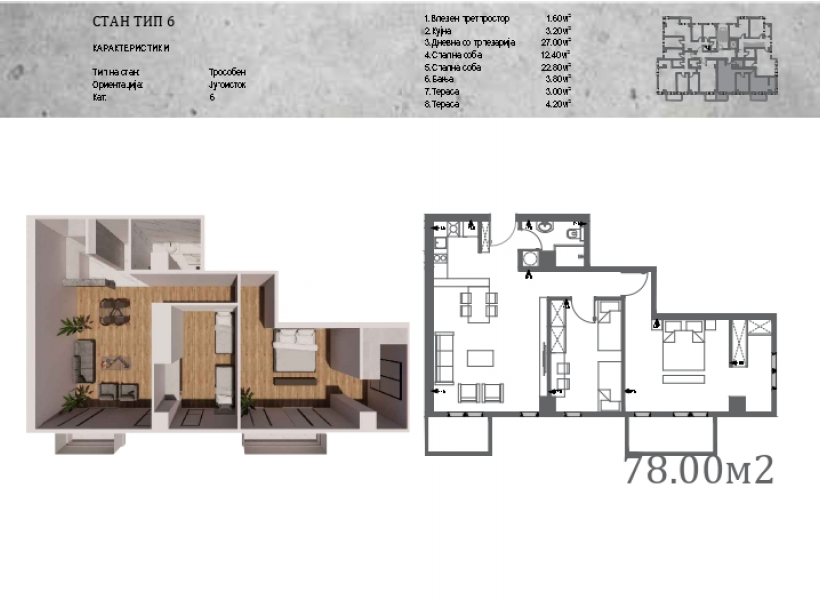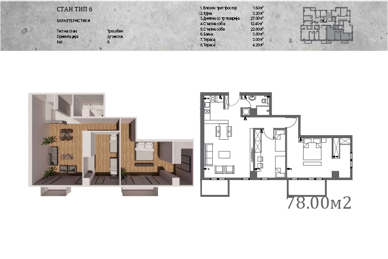 • Стан тип 6 – 78м², шести кат: дневна, кујна со трпезарија, две спални, бања, две тераси