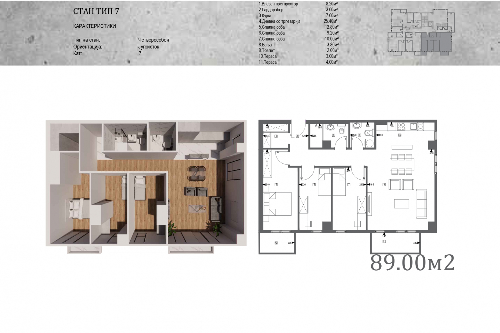 • Стан тип 7 – 89м², седми кат: дневна, кујна со трпезарија, три спални, бања, тоалет, остава/гардеробер, две тераси