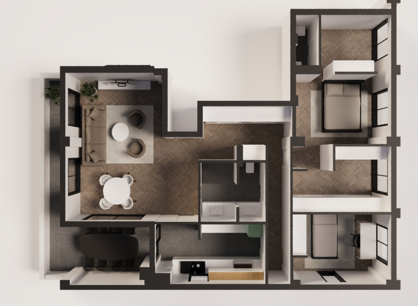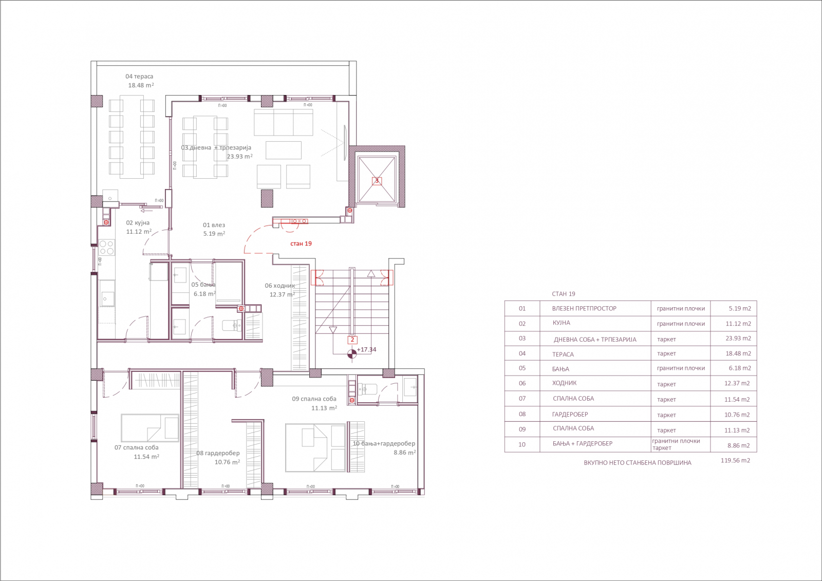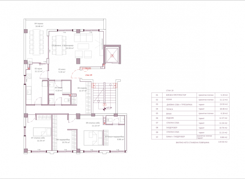 Станот располага со три спални соби, од кои едната спална со сопствен тоалет и простор за гардеробер, пространа дневна со трпезарија, одделна кујна, бања и тераса со површина од 18м2.