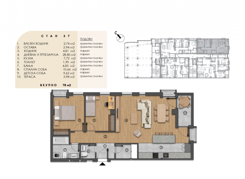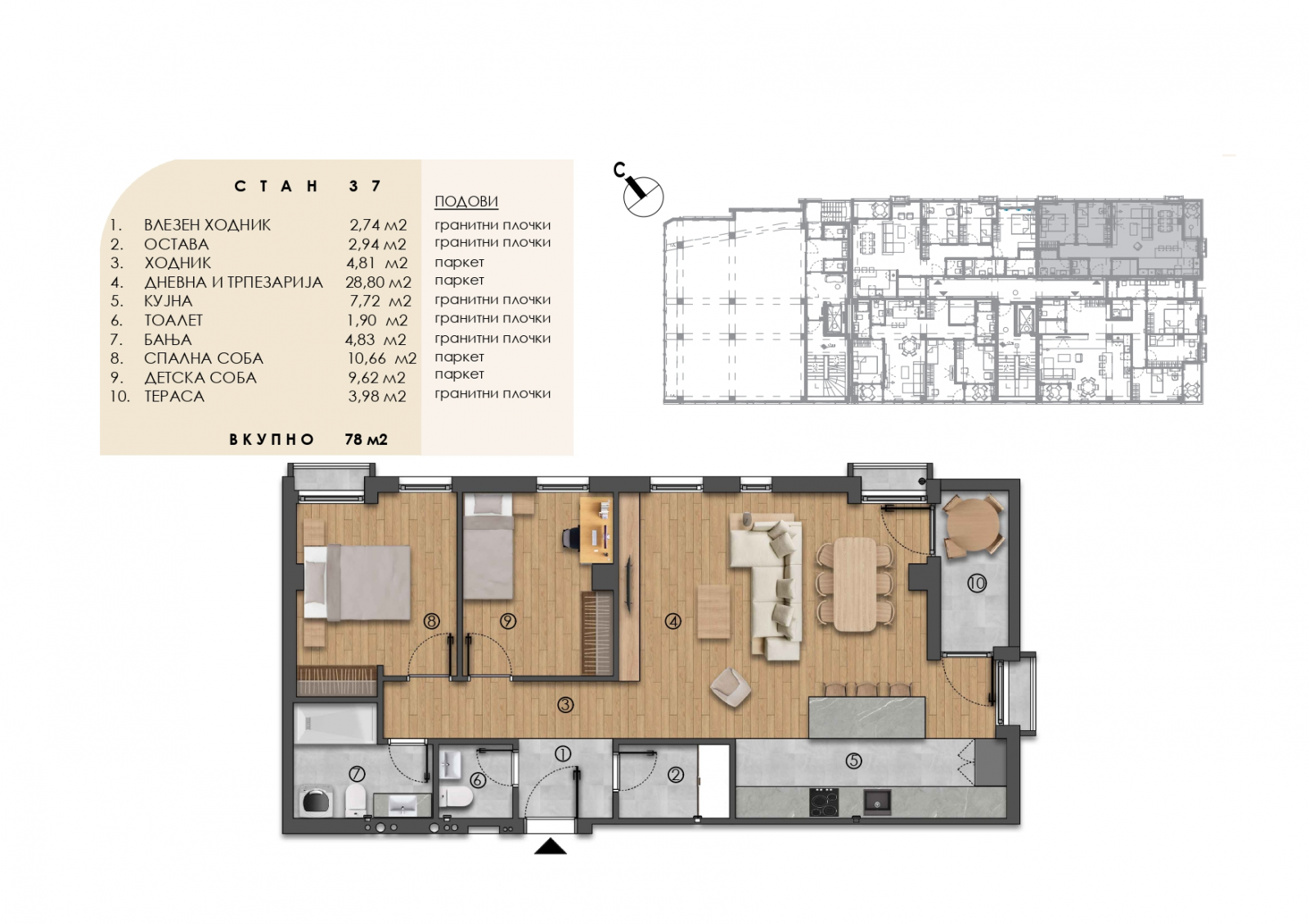 Нов стан лоциран во зграда во фаза на изградба, со вкупна површина од 78м2 и пространа кровна тераса.
