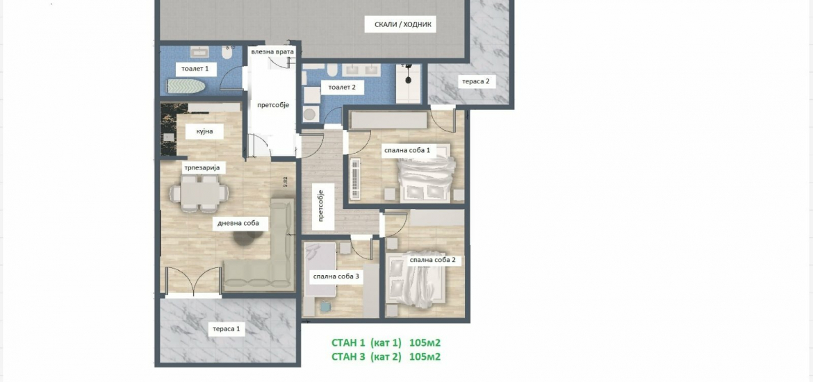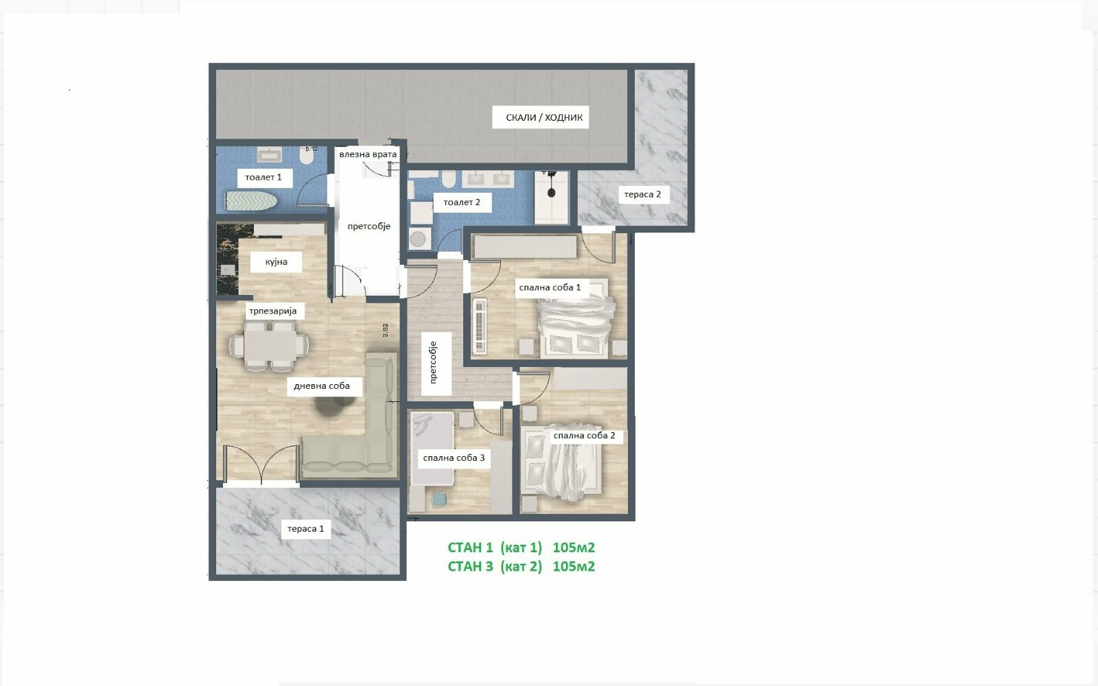 Просторен и светол стан со површина од 105 м², сместен на првиот кат во нова, квалитетно изградена зграда во мирен дел на Лисиче.