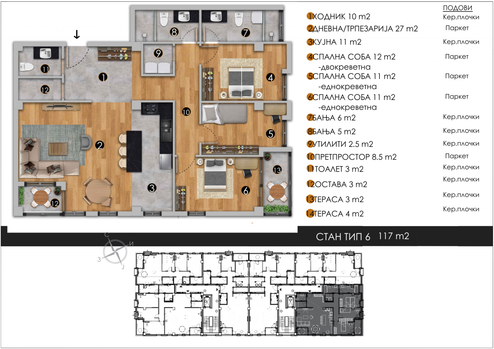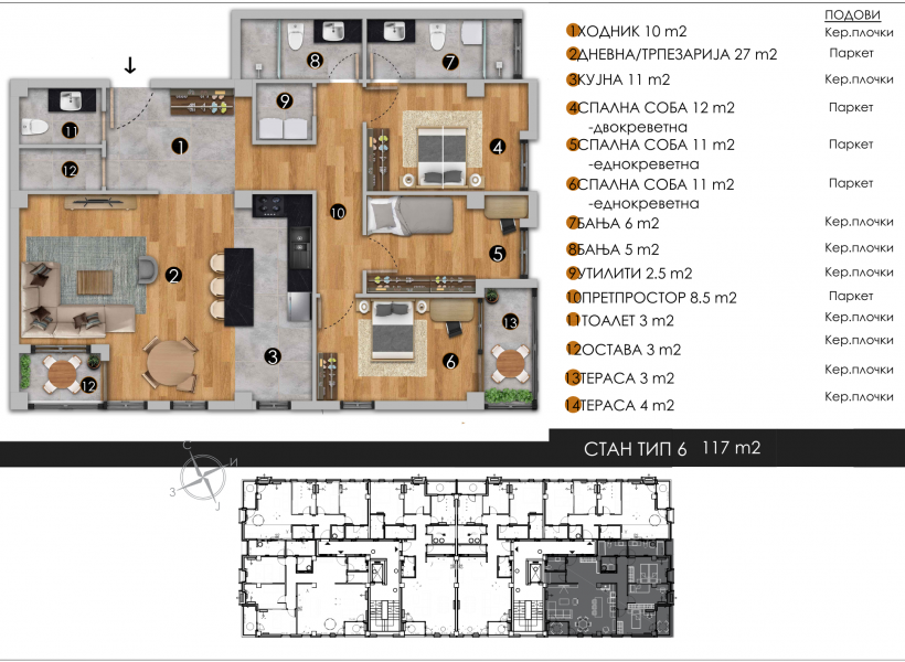 Станот располага со вкупна станбена површина од 117м2+117м2 кровна тераса вклучена во цената на станот.