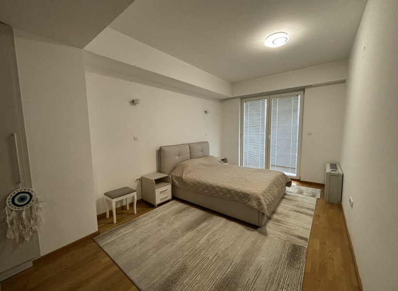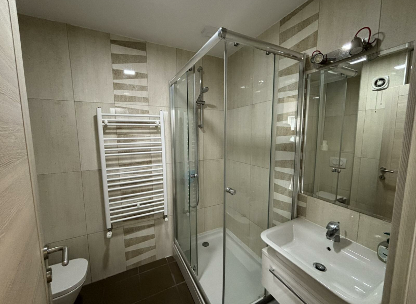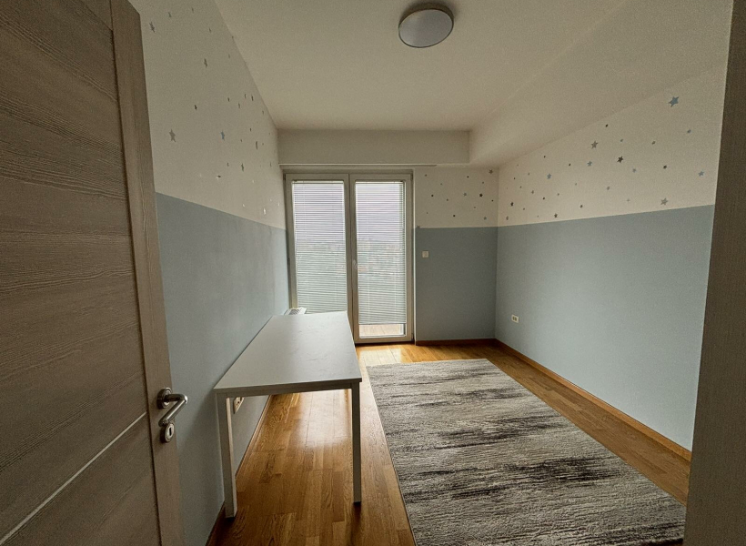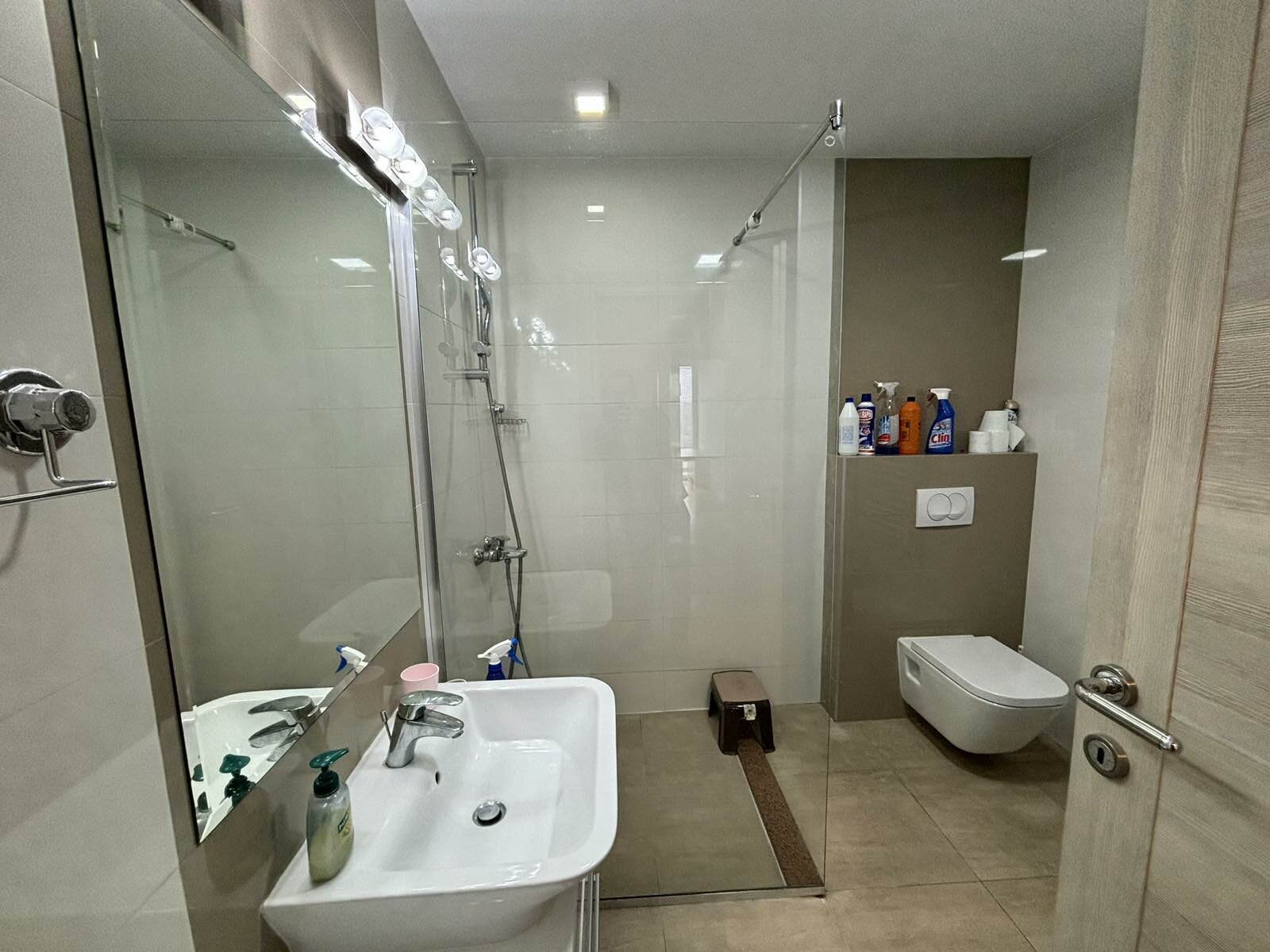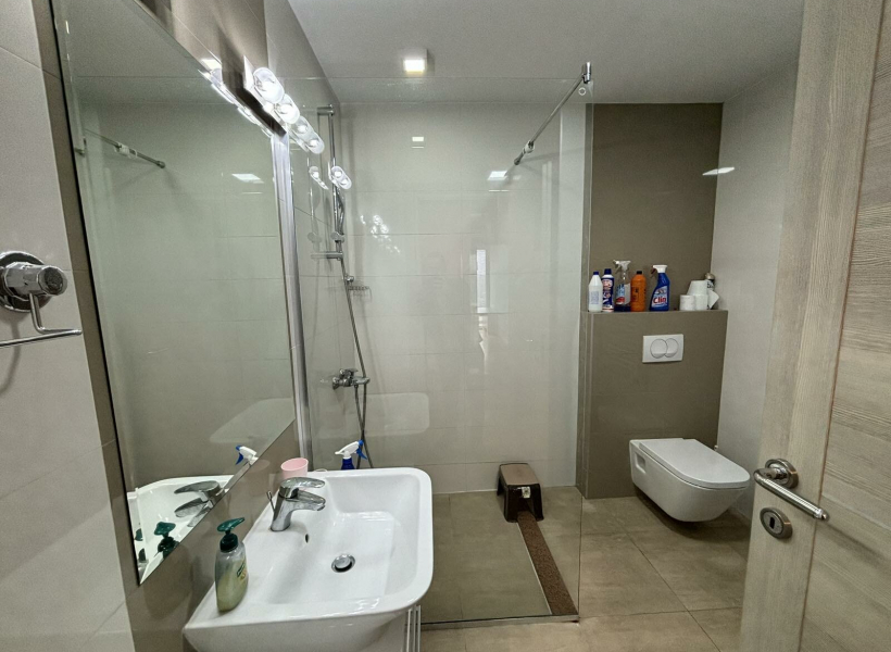 Овој простран трособен стан располага со три бањи, што гарантира комфор и приватност за секој член на семејството.