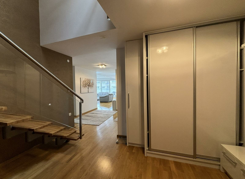 Станот исто така располага со две приватни гаражи, обезбедувајќи сигурно и лесно паркирање за вашите возила. Секој аспект на овој стан е дизајниран да обезбеди функционален, но и елегантен животен простор.